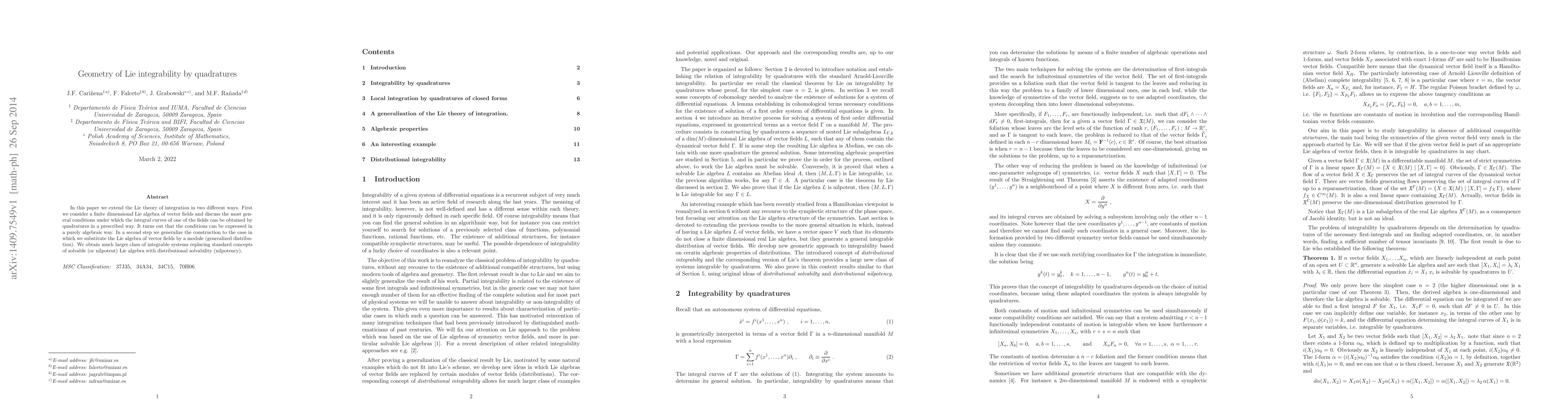 In this paper we extend the Lie theory of integration in two different ways. First we consider a finite dimensional Lie algebra of vector fields and discuss the most general conditions under which the integral curves of one of the fields can be obtained by quadratures in a prescribed way. It turns out that the conditions can be expressed in a purely algebraic way. In a second step we generalize the construction to the case in which we substitute the Lie algebra of vector fields by a module (generalized distribution). We obtain much larger class of integrable systems replacing standard concepts of solvable (or nilpotent) Lie algebra with distributional solvability (nilpotency).