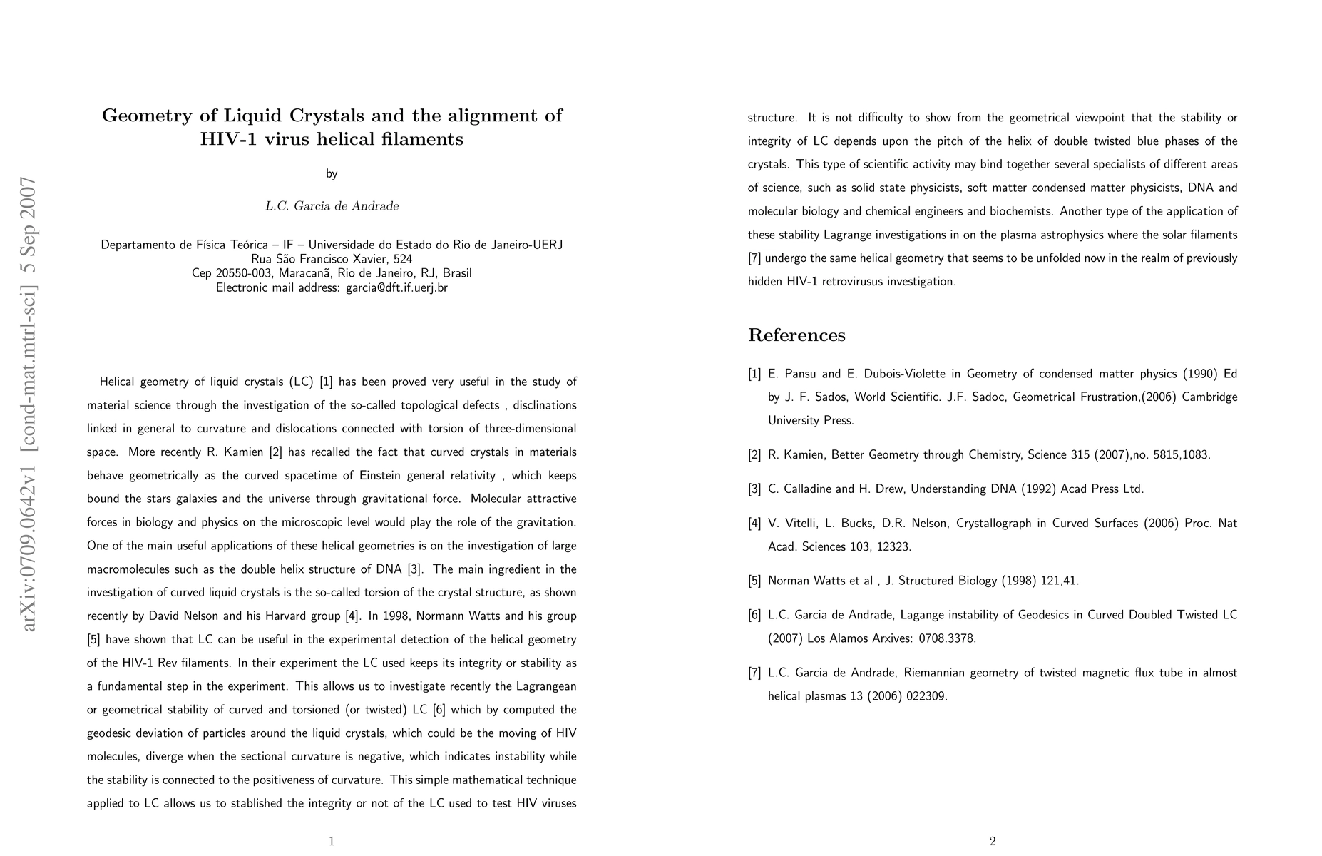 This paper explores the geometry of liquid crystals to detect the alignment of HIV-1 virus helical filaments, revealing how liquid crystal structures can serve as effective detectors for the twisted helical nature of these viral components.