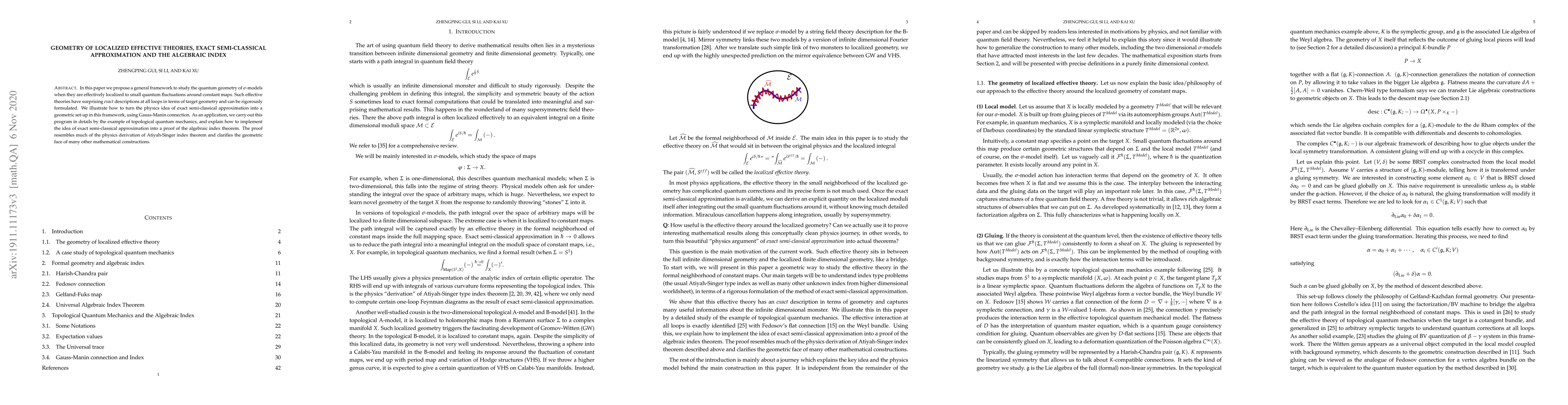 In this paper we propose a general framework to study the quantum geometry of $\sigma$-models when they are effectively localized to small quantum fluctuations around constant maps. Such effective theories have surprising exact descriptions at all loops in terms of target geometry and can be rigorously formulated. We illustrate how to turn the physics idea of exact semi-classical approximation into a geometric set-up in this framework, using Gauss-Manin connection. As an application, we carry out this program in details by the example of topological quantum mechanics, and explain how to implement the idea of exact semi-classical approximation into a proof of the algebraic index theorem. The proof resembles much of the physics derivation of Atiyah-Singer index theorem and clarifies the geometric face of many other mathematical constructions.