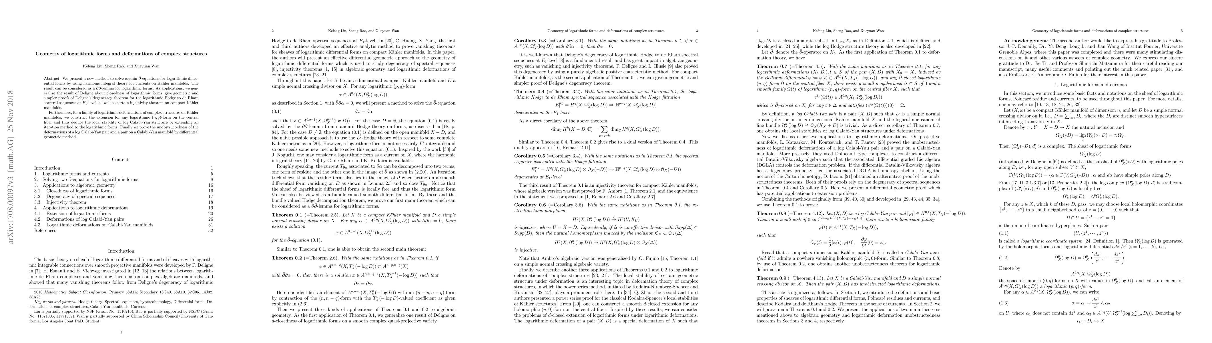 We present a new method to solve certain $\bar{\partial}$-equations for logarithmic differential forms by using harmonic integral theory for currents on Kahler manifolds. The result can be considered as a $\bar{\partial}$-lemma for logarithmic forms. As applications, we generalize the result of Deligne about closedness of logarithmic forms, give geometric and simpler proofs of Deligne's degeneracy theorem for the logarithmic Hodge to de Rham spectral sequences at $E_1$-level, as well as certain injectivity theorem on compact Kahler manifolds. Furthermore, for a family of logarithmic deformations of complex structures on Kahler manifolds, we construct the extension for any logarithmic $(n,q)$-form on the central fiber and thus deduce the local stability of log Calabi-Yau structure by extending an iteration method to the logarithmic forms. Finally we prove the unobstructedness of the deformations of a log Calabi-Yau pair and a pair on a Calabi-Yau manifold by differential geometric method.