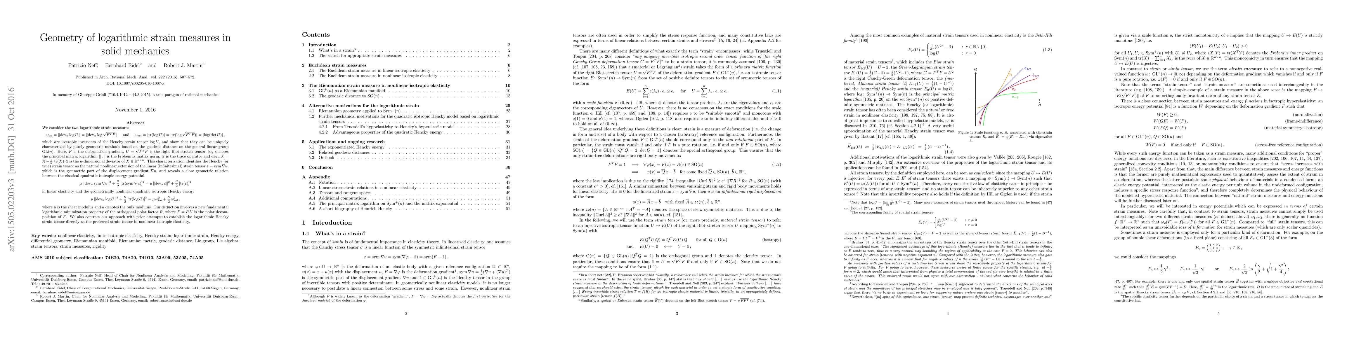This paper characterizes two logarithmic strain measures in solid mechanics using geometric methods based on the geodesic distance on the general linear group. It reveals the Hencky strain tensor as a natural extension of the linear strain tensor and establishes a geometric relation between the linear and geometrically nonlinear isotropic energy potentials.