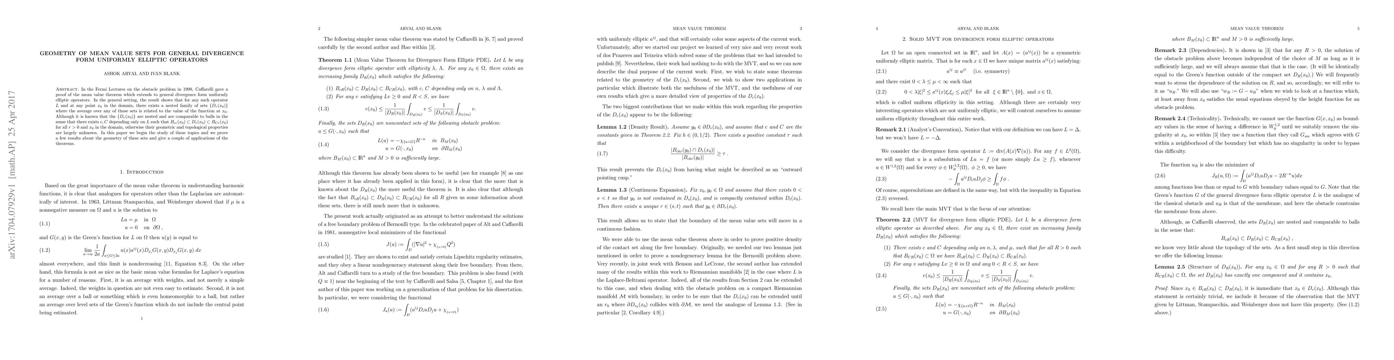 In the Fermi Lectures on the obstacle problem in 1998, Caffarelli gave a proof of the mean value theorem which extends to general divergence form uniformly elliptic operators. In the general setting, the result shows that for any such operator $L$ and at any point $x_0$ in the domain, there exists a nested family of sets $\{ D_r(x_0) \}$ where the average over any of those sets is related to the value of the function at $x_0.$ Although it is known that the $\{ D_r(x_0) \}$ are nested and are comparable to balls in the sense that there exists $c, C$ depending only on $L$ such that $B_{cr}(x_0) \subset D_r(x_0) \subset B_{Cr}(x_0)$ for all $r > 0$ and $x_0$ in the domain, otherwise their geometric and topological properties are largely unknown. In this paper we begin the study of these topics and we prove a few results about the geometry of these sets and give a couple of applications of the theorems.
