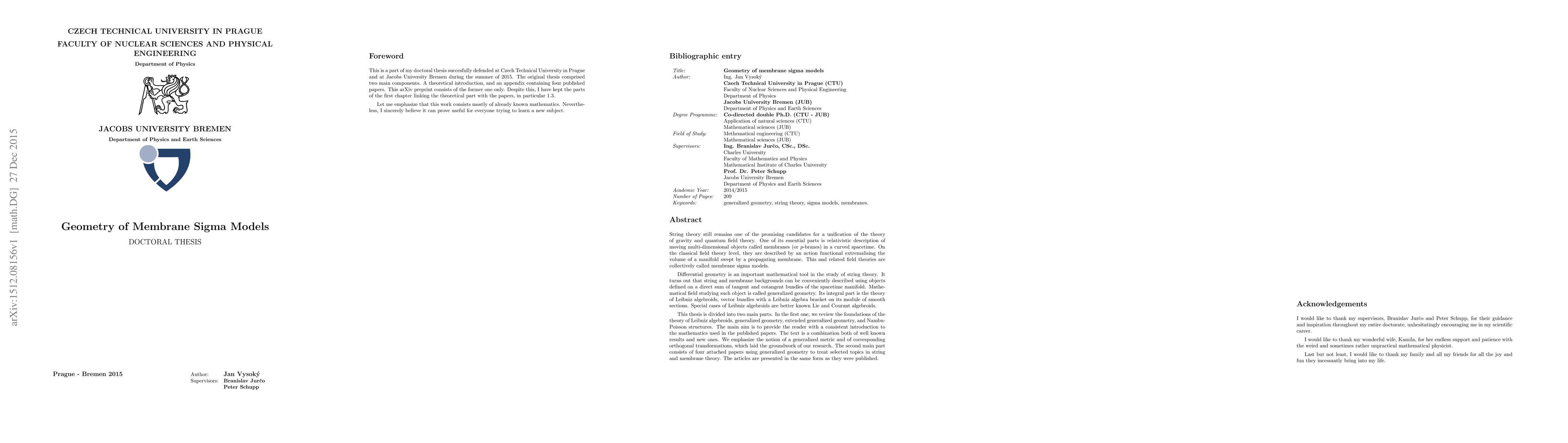 String theory still remains one of the promising candidates for a unification of the theory of gravity and quantum field theory. One of its essential parts is relativistic description of moving multi-dimensional objects called membranes (or p-branes) in a curved spacetime. On the classical field theory level, they are described by an action functional extremalising the volume of a manifold swept by a propagating membrane. This and related field theories are collectively called membrane sigma models. Differential geometry is an important mathematical tool in the study of string theory. It turns out that string and membrane backgrounds can be conveniently described using objects defined on a direct sum of tangent and cotangent bundles of the spacetime manifold. Mathematical field studying such object is called generalized geometry. Its integral part is the theory of Leibniz algebroids, vector bundles with a Leibniz algebra bracket on its module of smooth sections. Special cases of Leibniz algebroids are better known Lie and Courant algebroids. This thesis is divided into two main parts (the second one is ommited in this preprint). In the first one, we review the foundations of the theory of Leibniz algebroids, generalized geometry, extended generalized geometry, and NambuPoisson structures. The main aim is to provide the reader with a consistent introduction to the mathematics used in the published papers. The text is a combination both of well known results and new ones. We emphasize the notion of a generalized metric and of corresponding orthogonal transformations, which laid the groundwork of our research.