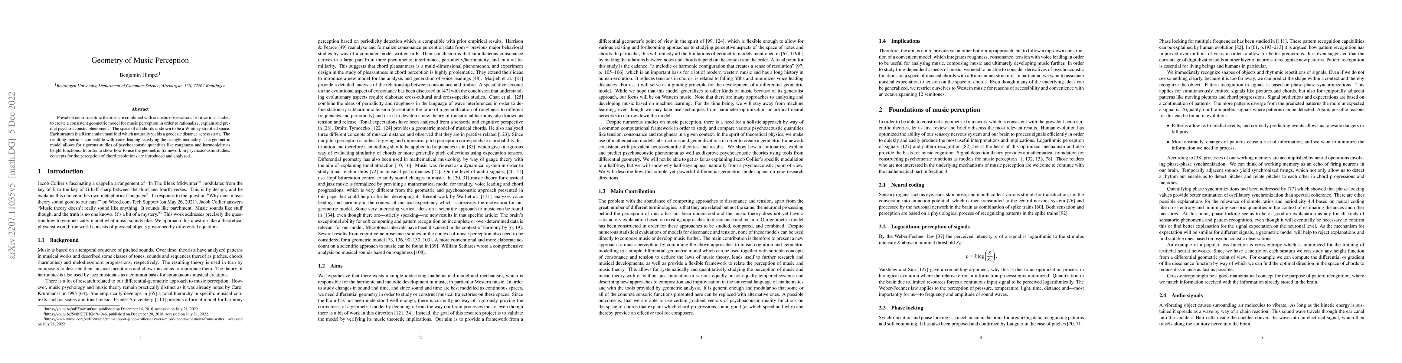 Prevalent neuroscientific theories are combined with acoustic observations from various studies to create a consistent geometric model for music perception in order to rationalize, explain and predict psycho-acoustic phenomena. The space of all chords is shown to be a Whitney stratified space. Each stratum is a Riemannian manifold which naturally yields a geodesic distance across strata. The resulting metric is compatible with voice-leading satisfying the triangle inequality. The geometric model allows for rigorous studies of psychoacoustic quantities like roughness and harmonicity as height functions. In order to show how to use the geometric framework in psychoacoustic studies, concepts for the perception of chord resolutions are introduced and analyzed.