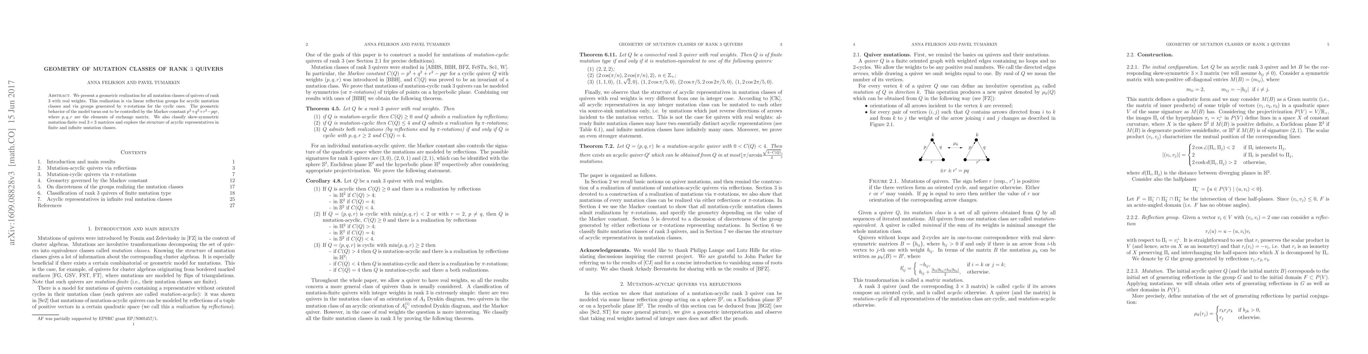 This paper geometrically realizes mutation classes of rank $3$ quivers using linear reflection groups for acyclic classes and $\pi$-rotations for cyclic ones, with behavior governed by the Markov constant. It also classifies skew-symmetric mutation-finite $3\times 3$ matrices and examines the structure of acyclic representatives.