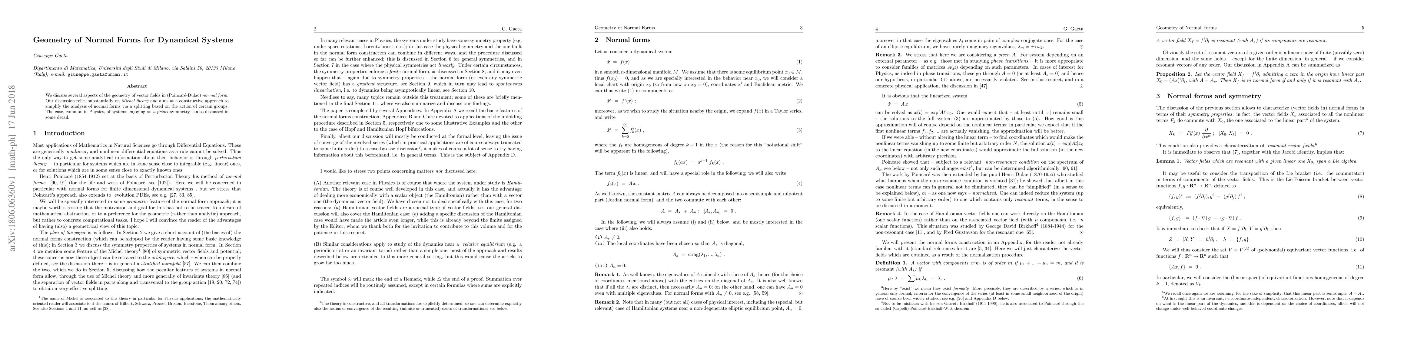 This paper explores the geometry of dynamical systems expressed in Poincare-Dulac normal form, utilizing Michel theory for a constructive simplification approach based on group actions, with a focus on systems possessing inherent symmetries, common in physics.