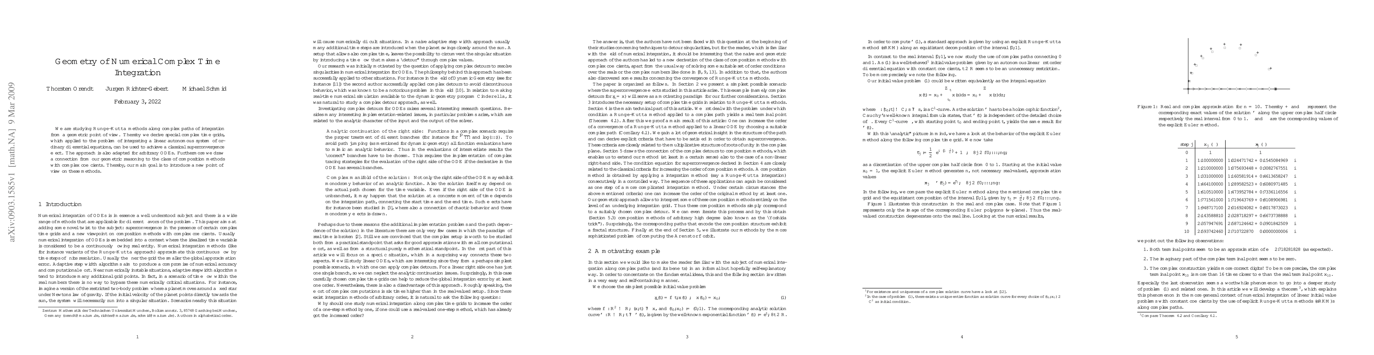 We are studying Runge-Kutta methods along complex paths of integration from a geometric point of view. Thereby we derive special complex time grids, which applied to the problem of integrating a linear autonomous system of ordinary differential equations, can be used to achieve a classical superconvergence effect. The approach is also adapted for arbitrary ODEs. Furthermore we draw a connection from our geometric reasoning to the class of composition methods with complex coefficients. Thereby, our main goal is to introduce a new point of view on these methods.