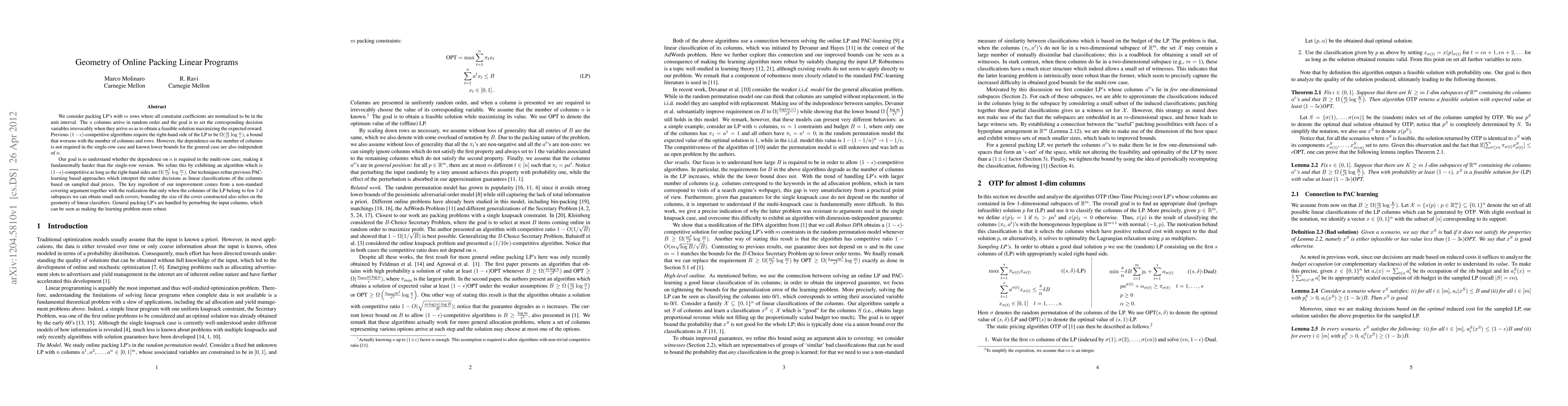 The paper analyzes online packing linear programs (LPs) with normalized constraint coefficients, focusing on the geometry of the problem and refining PAC-learning based approaches to achieve improved competitive ratios.