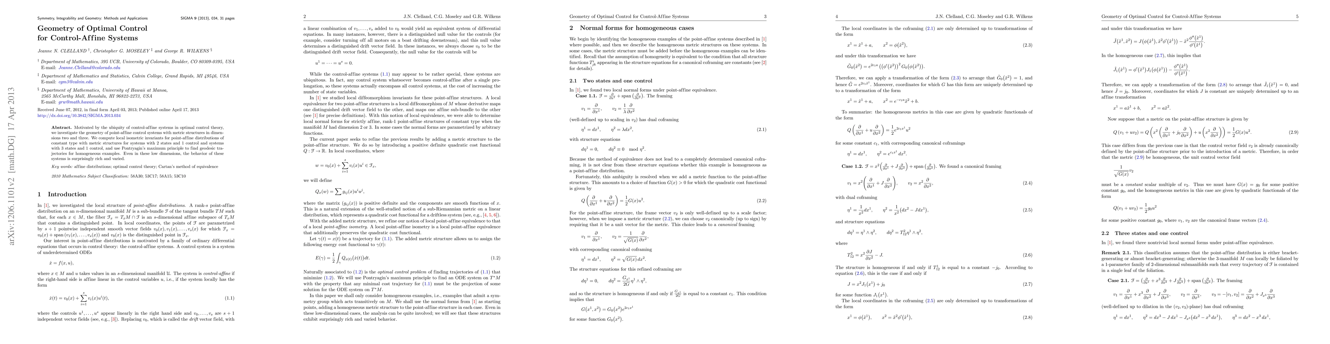 This paper explores the geometric properties of optimal control for control-affine systems with metric structures in two and three dimensions, computing local isometric invariants and using Pontryagin's maximum principle to determine geodesic trajectories for homogeneous examples. Despite the simplicity of dimensions, the systems exhibit complex and varied behavior.