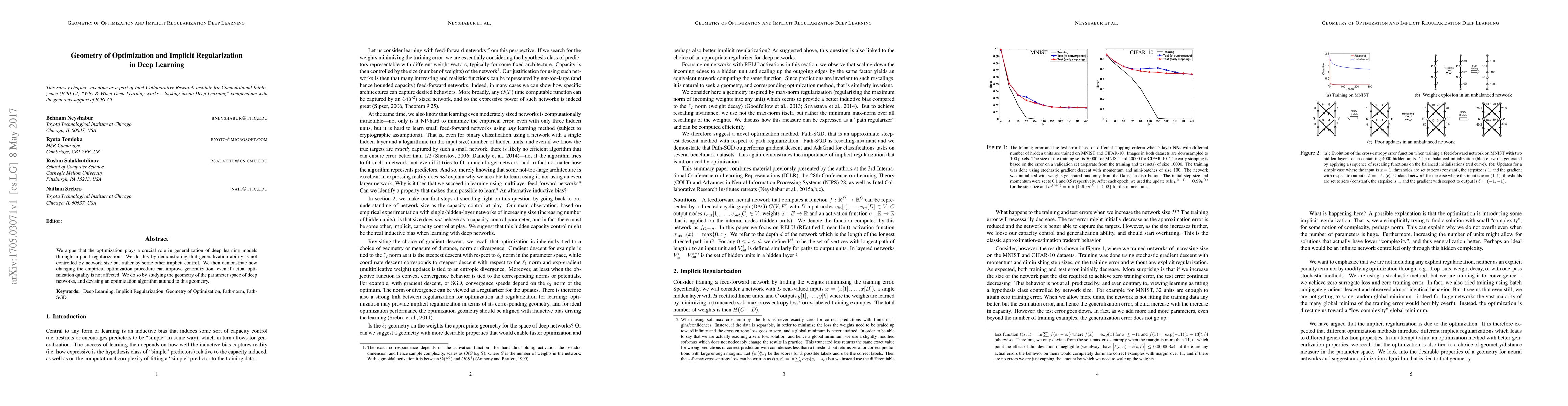 We argue that the optimization plays a crucial role in generalization of deep learning models through implicit regularization. We do this by demonstrating that generalization ability is not controlled by network size but rather by some other implicit control. We then demonstrate how changing the empirical optimization procedure can improve generalization, even if actual optimization quality is not affected. We do so by studying the geometry of the parameter space of deep networks, and devising an optimization algorithm attuned to this geometry.