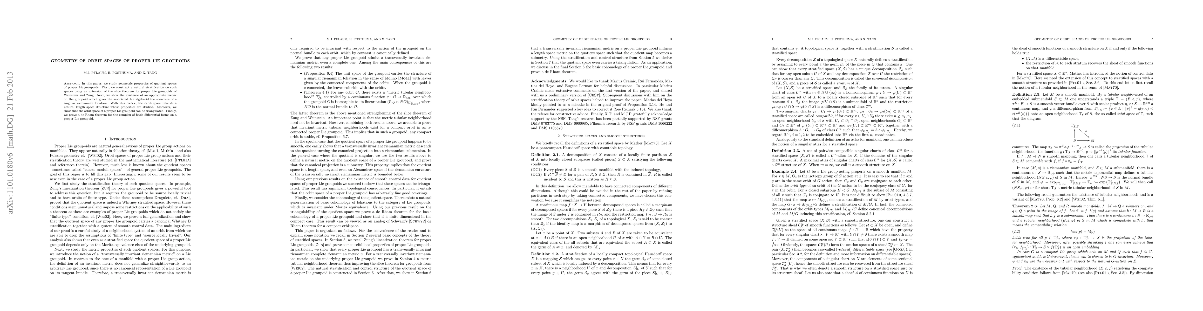 This paper explores the geometric properties of orbit spaces derived from proper Lie groupoids, establishing a stratification via an extension of the slice theorem. It introduces a metric on the groupoid to endow its Lie algebroid with a singular Riemannian foliation structure, analyzes the resulting length space properties, and demonstrates the triangulability of the orbit space. The paper concludes with a proof of a de Rham theorem for basic differential forms on the groupoid.