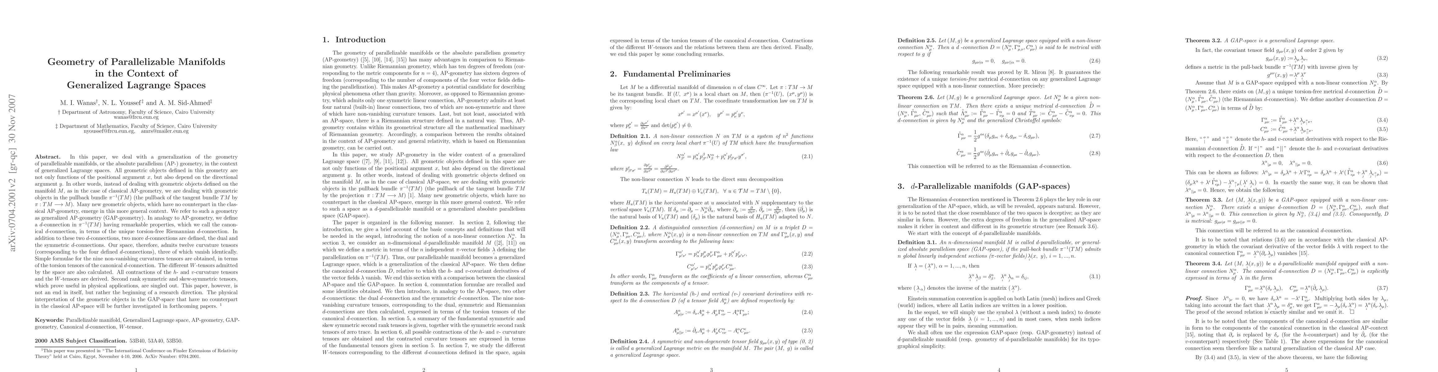In this paper, we deal with a generalization of the geometry of parallelizable manifolds, or the absolute parallelism (AP-) geometry, in the context of generalized Lagrange spaces. All geometric objects defined in this geometry are not only functions of the positional argument $x$, but also depend on the directional argument $y$. In other words, instead of dealing with geometric objects defined on the manifold $M$, as in the case of classical AP-geometry, we are dealing with geometric objects in the pullback bundle $\pi^{-1}(TM)$ (the pullback of the tangent bundle $TM$ by $ \pi: T M\longrightarrow M$). Many new geometric objects, which have no counterpart in the classical AP-geometry, emerge in this more general context. We refer to such a geometry as generalized AP-geometry (GAP-geometry). In analogy to AP-geometry, we define a $d$-connection in $\pi^{-1}(TM)$ having remarkable properties, which we call the canonical $d$-connection, in terms of the unique torsion-free Riemannian $d$-connection. In addition to these two $d$-connections, two more $d$-connections are defined, the dual and the symmetric $d$-connections. Our space, therefore, admits twelve curvature tensors (corresponding to the four defined $d$-connections), three of which vanish identically. Simple formulae for the nine non-vanishing curvatures tensors are obtained, in terms of the torsion tensors of the canonical $d$-connection. The different $W$-tensors admitted by the space are also calculated. All contractions of the $h$- and $v$-curvature tensors and the $W$-tensors are derived. Second rank symmetric and skew-symmetric tensors, which prove useful in physical applications, are singled out.