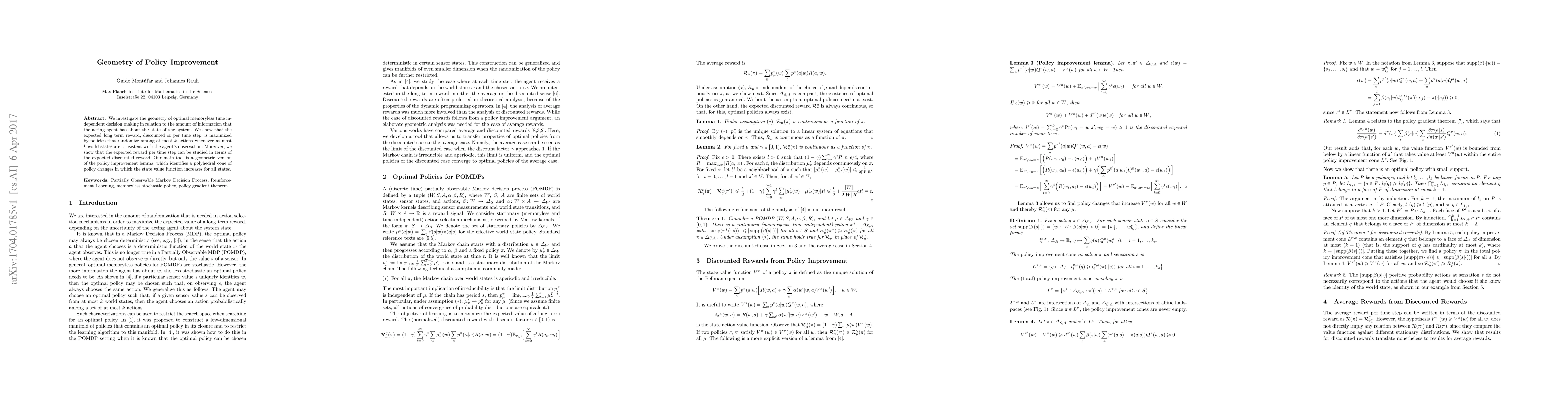 We investigate the geometry of optimal memoryless time independent decision making in relation to the amount of information that the acting agent has about the state of the system. We show that the expected long term reward, discounted or per time step, is maximized by policies that randomize among at most $k$ actions whenever at most $k$ world states are consistent with the agent's observation. Moreover, we show that the expected reward per time step can be studied in terms of the expected discounted reward. Our main tool is a geometric version of the policy improvement lemma, which identifies a polyhedral cone of policy changes in which the state value function increases for all states.