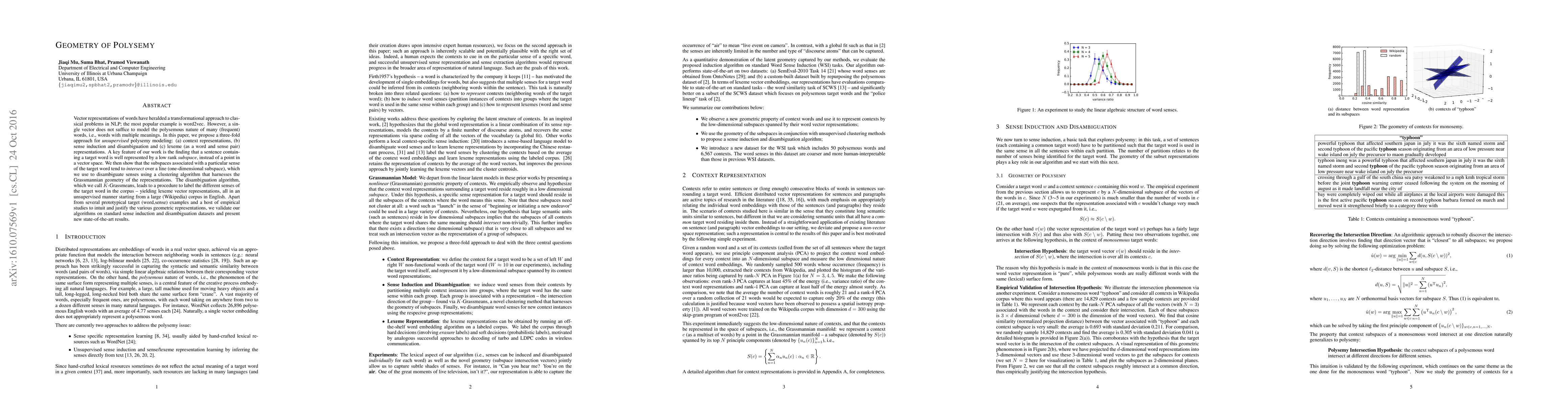 Vector representations of words have heralded a transformational approach to classical problems in NLP; the most popular example is word2vec. However, a single vector does not suffice to model the polysemous nature of many (frequent) words, i.e., words with multiple meanings. In this paper, we propose a three-fold approach for unsupervised polysemy modeling: (a) context representations, (b) sense induction and disambiguation and (c) lexeme (as a word and sense pair) representations. A key feature of our work is the finding that a sentence containing a target word is well represented by a low rank subspace, instead of a point in a vector space. We then show that the subspaces associated with a particular sense of the target word tend to intersect over a line (one-dimensional subspace), which we use to disambiguate senses using a clustering algorithm that harnesses the Grassmannian geometry of the representations. The disambiguation algorithm, which we call $K$-Grassmeans, leads to a procedure to label the different senses of the target word in the corpus -- yielding lexeme vector representations, all in an unsupervised manner starting from a large (Wikipedia) corpus in English. Apart from several prototypical target (word,sense) examples and a host of empirical studies to intuit and justify the various geometric representations, we validate our algorithms on standard sense induction and disambiguation datasets and present new state-of-the-art results.