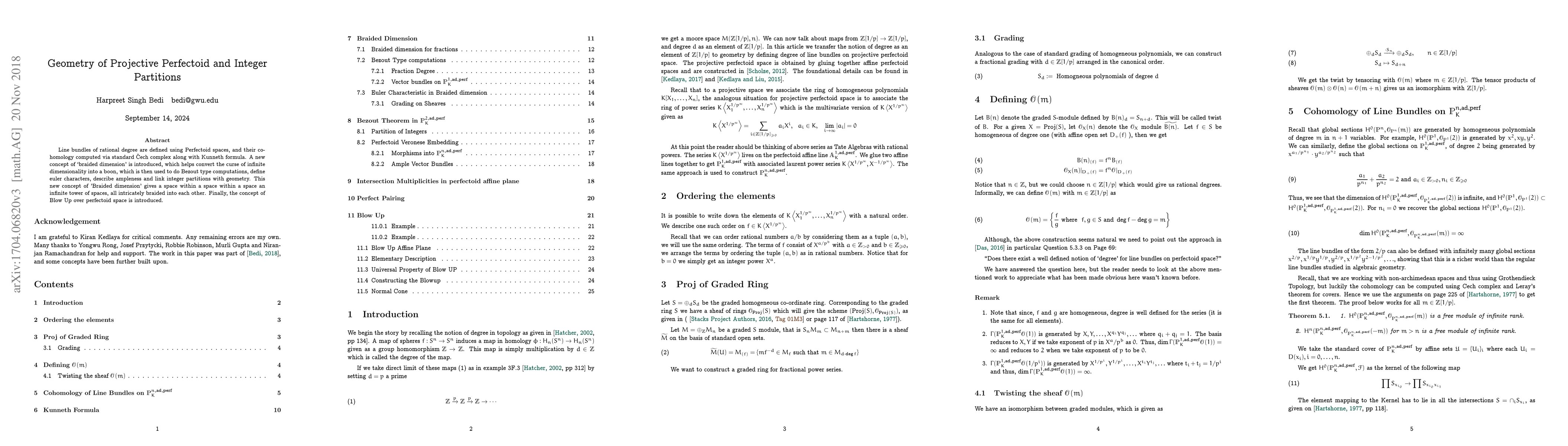 Line bundles of rational degree are defined using Perfectoid spaces, and their co-homology computed via standard \v{C}ech complex along with Kunneth formula. A new concept of `braided dimension' is introduced, which helps convert the curse of infinite dimensionality into a boon, which is then used to do Bezout type computations, define euler characters, describe ampleness and link integer partitions with geometry. This new concept of 'Braided dimension' gives a space within a space within a space an infinite tower of spaces, all intricately braided into each other. Finally, the concept of Blow Up over perfectoid space is introduced.
