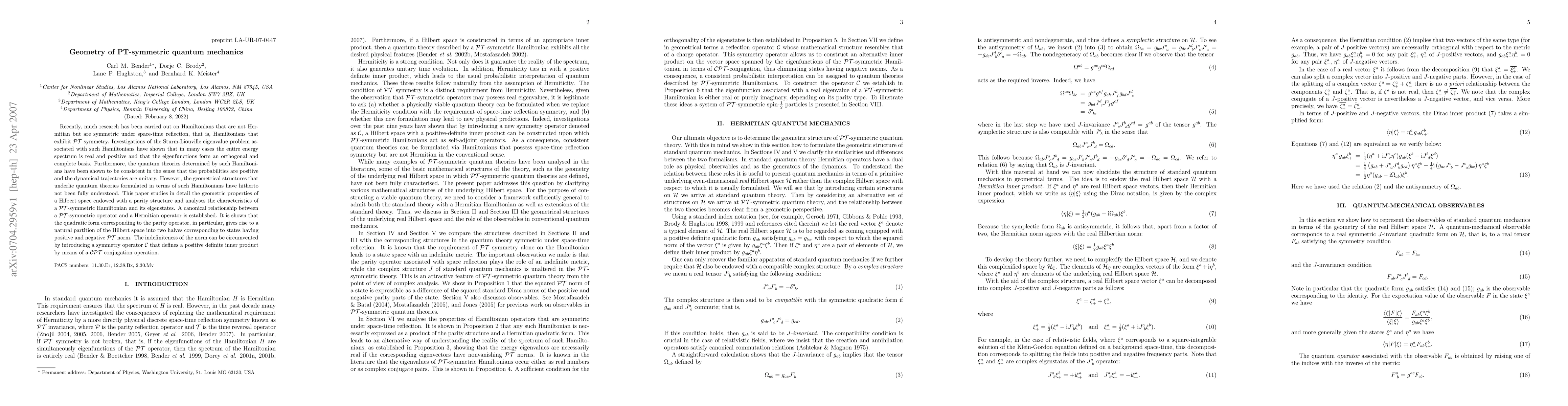 Recently, much research has been carried out on Hamiltonians that are not Hermitian but are symmetric under space-time reflection, that is, Hamiltonians that exhibit PT symmetry. Investigations of the Sturm-Liouville eigenvalue problem associated with such Hamiltonians have shown that in many cases the entire energy spectrum is real and positive and that the eigenfunctions form an orthogonal and complete basis. Furthermore, the quantum theories determined by such Hamiltonians have been shown to be consistent in the sense that the probabilities are positive and the dynamical trajectories are unitary. However, the geometrical structures that underlie quantum theories formulated in terms of such Hamiltonians have hitherto not been fully understood. This paper studies in detail the geometric properties of a Hilbert space endowed with a parity structure and analyses the characteristics of a PT-symmetric Hamiltonian and its eigenstates. A canonical relationship between a PT-symmetric operator and a Hermitian operator is established. It is shown that the quadratic form corresponding to the parity operator, in particular, gives rise to a natural partition of the Hilbert space into two halves corresponding to states having positive and negative PT norm. The indefiniteness of the norm can be circumvented by introducing a symmetry operator C that defines a positive definite inner product by means of a CPT conjugation operation.