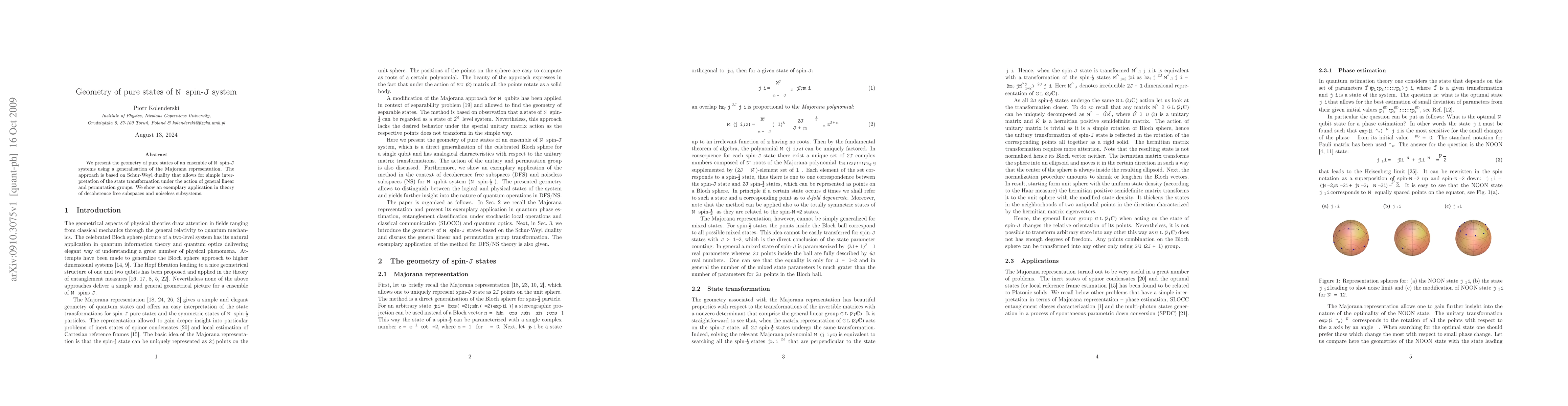 We present the geometry of pure states of an ensemble of N spin-J systems using a generalisation of the Majorana representation. The approach is based on Schur-Weyl duality that allows for simple interpretation of the state transformation under the action of general linear and permutation groups. We show an exemplary application in theory of decoherence free subspaces and noiseless subsystems.