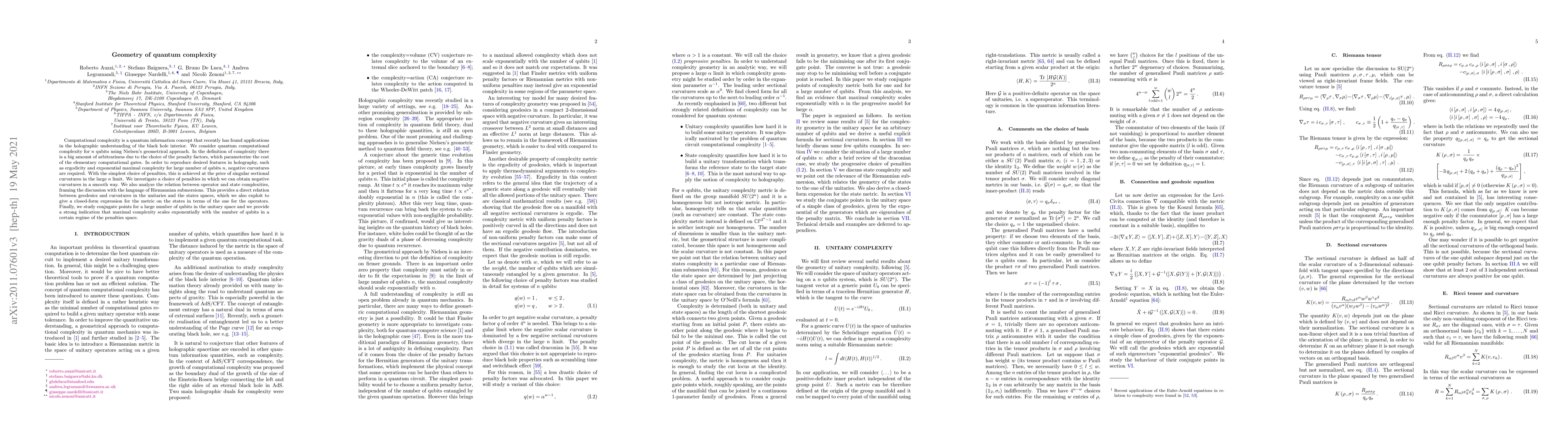 Computational complexity is a new quantum information concept that may play an important role in holography and in understanding the physics of the black hole interior. We consider quantum computational complexity for $n$ qubits using Nielsen's geometrical approach. We investigate a choice of penalties which, compared to previous definitions, increases in a more progressive way with the number of qubits simultaneously entangled by a given operation. This choice turns out to be free from singularities. We also analyze the relation between operator and state complexities, framing the discussion with the language of Riemannian submersions. This provides a direct relation between geodesics and curvatures in the unitaries and the states spaces, which we also exploit to give a closed-form expression for the metric on the states in terms of the one for the operators. Finally, we study conjugate points for a large number of qubits in the unitary space and we provide a strong indication that maximal complexity scales exponentially with the number of qubits in a certain regime of the penalties space.