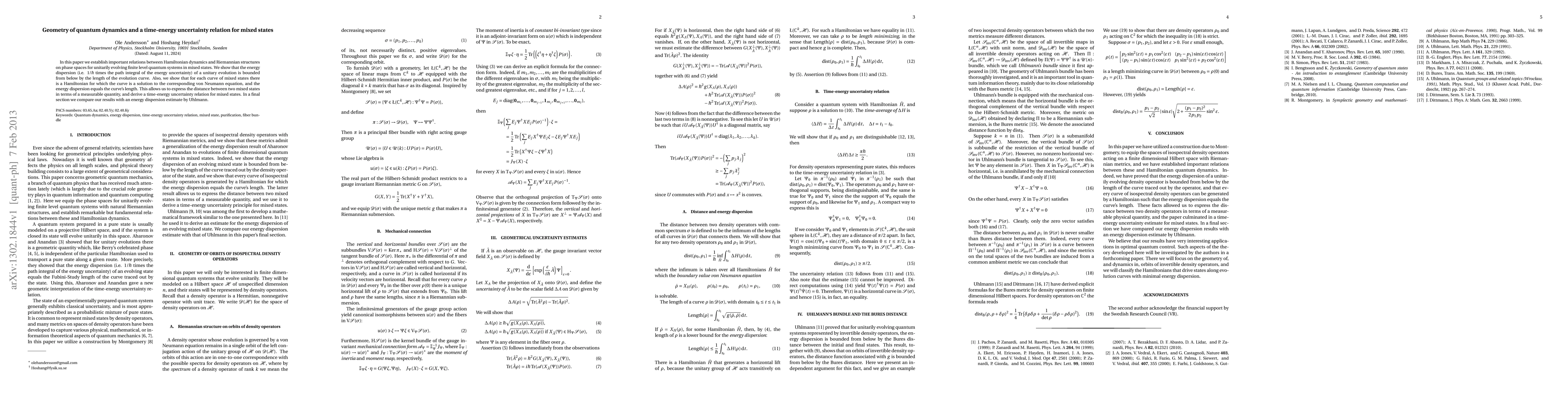 In this paper we establish important relations between Hamiltonian dynamics and Riemannian structures on phase spaces for unitarily evolving finite level quantum systems in mixed states. We show that the energy dispersion (i.e. $1/\hbar$ times the path integral of the energy uncertainty) of a unitary evolution is bounded from below by the length of the evolution curve. Also, we show that for each curve of mixed states there is a Hamiltonian for which the curve is a solution to the corresponding von Neumann equation, and the energy dispersion equals the curve's length. This allows us to express the distance between two mixed states in terms of a measurable quantity, and derive a time-energy uncertainty relation for mixed states. In a final section we compare our results with an energy dispersion estimate by Uhlmann.