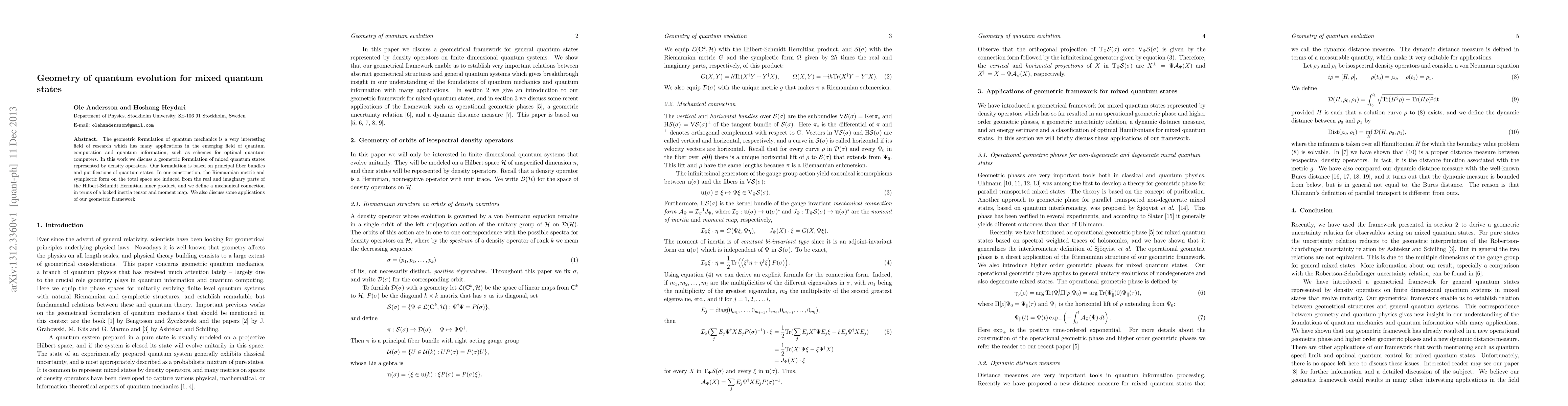 This paper presents a geometric framework for mixed quantum states using principal fiber bundles and purifications, defining a Riemannian metric and symplectic form based on the Hilbert-Schmidt inner product, and introducing a mechanical connection via a locked inertia tensor and moment map, with applications in quantum computation and information.