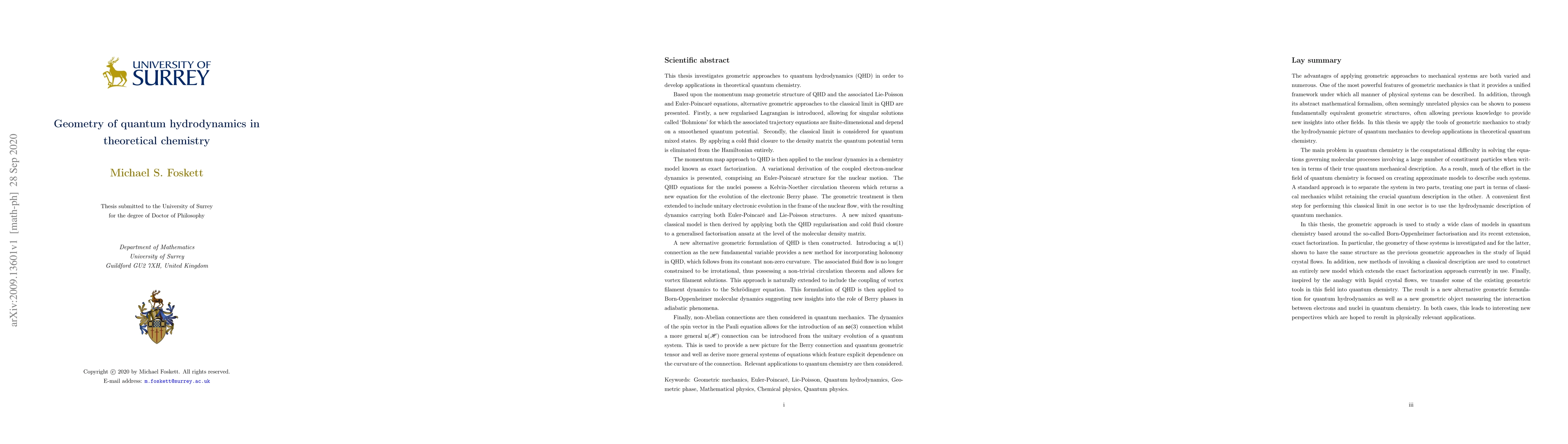 This research explores geometric methods in quantum hydrodynamics (QHD) for theoretical chemistry applications. It introduces new Lagrangian and mixed quantum-classical models, a novel $mathfrak{u}(1)$ connection for holonomy in QHD, and extends to non-Abelian connections in quantum mechanics, providing fresh perspectives on the Berry connection and quantum geometric tensor.
