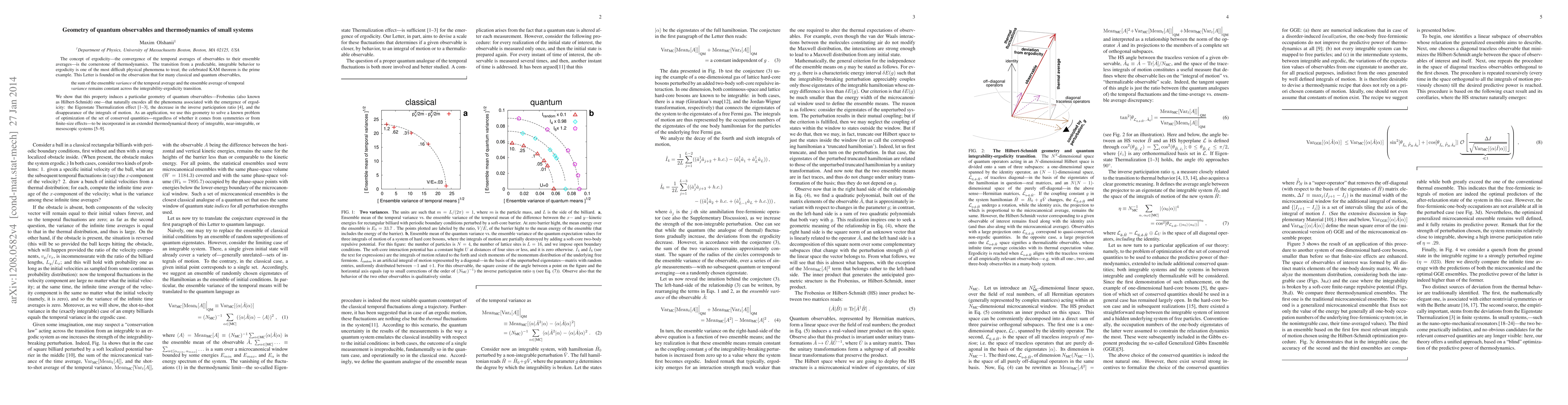 This paper explores the geometry of quantum observables and demonstrates that the sum of ensemble variance and temporal variance remains constant across the integrability-ergodicity transition. It reveals a Frobenius geometry that encodes phenomena like Eigenstate Thermalization and the disappearance of integrals of motion, and applies this to optimize conserved quantities for thermodynamic theories of small systems.
