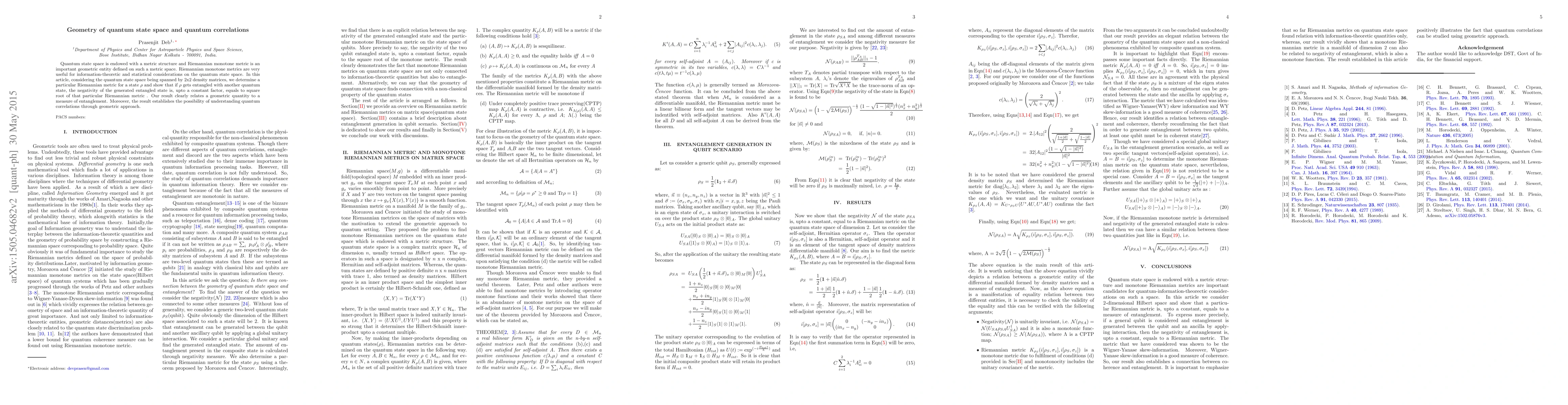 This research identifies a specific Riemannian metric for quantum states represented by 2x2 density matrices. It demonstrates that the negativity, a measure of entanglement in quantum states, is proportional to the square root of this metric, linking geometric properties to quantum correlation measures.