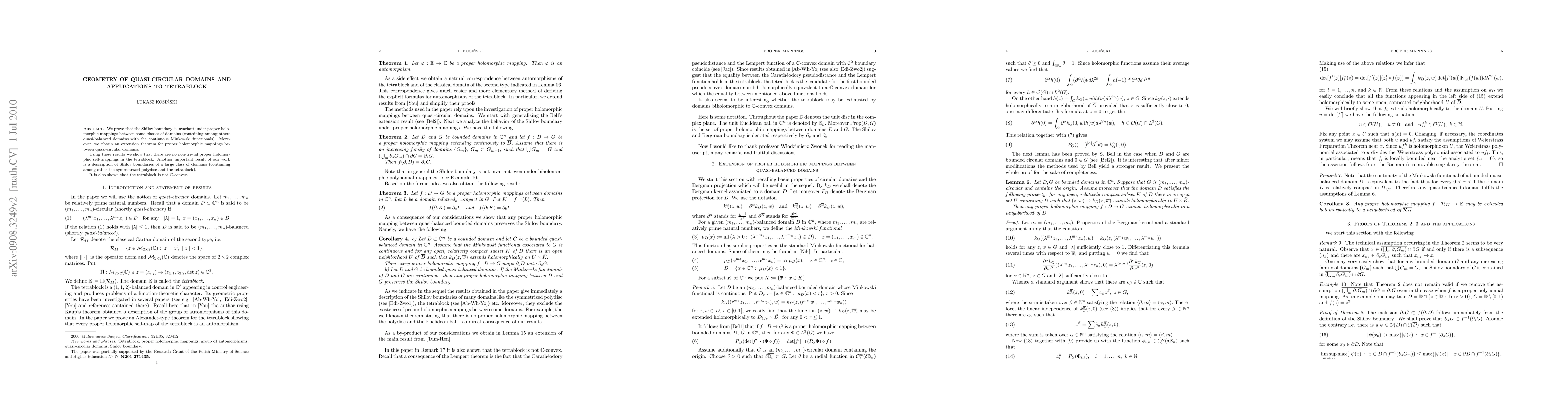 We prove that the Shilov boundary is invariant under proper holomorphic mappings between some classes of domains (containing among others quasi-balanced domains with the continuous Minkowski functionals). Moreover, we obtain an extension theorem for proper holomorphic mappings between quasi-circular domains. Using these results we show that there are no non-trivial proper holomorphic self-mappings in the tetrablock. Another important result of our work is a description of Shilov boundaries of a large class of domains (containing among other the symmetrized polydisc and the tetrablock). It is also shown that the tetrablock is not $\mathbb C$-convex.