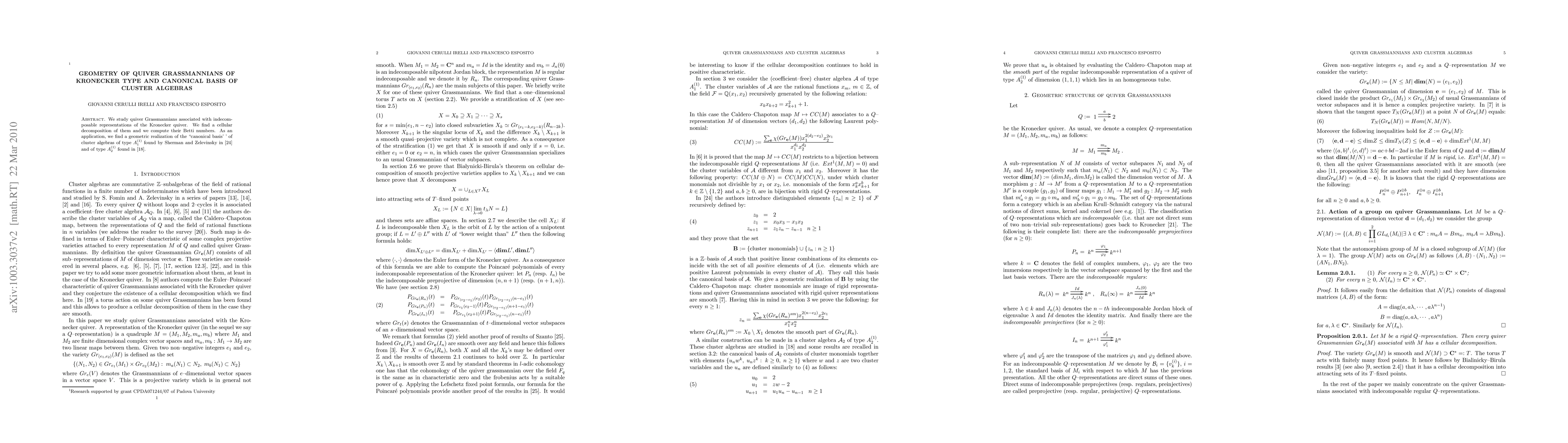 Summary: This paper investigates the geometry of quiver Grassmannians linked to Kronecker quiver representations, presenting a cellular decomposition and Betti number computations, and uses these insights to geometrically realize the canonical basis of cluster algebras.