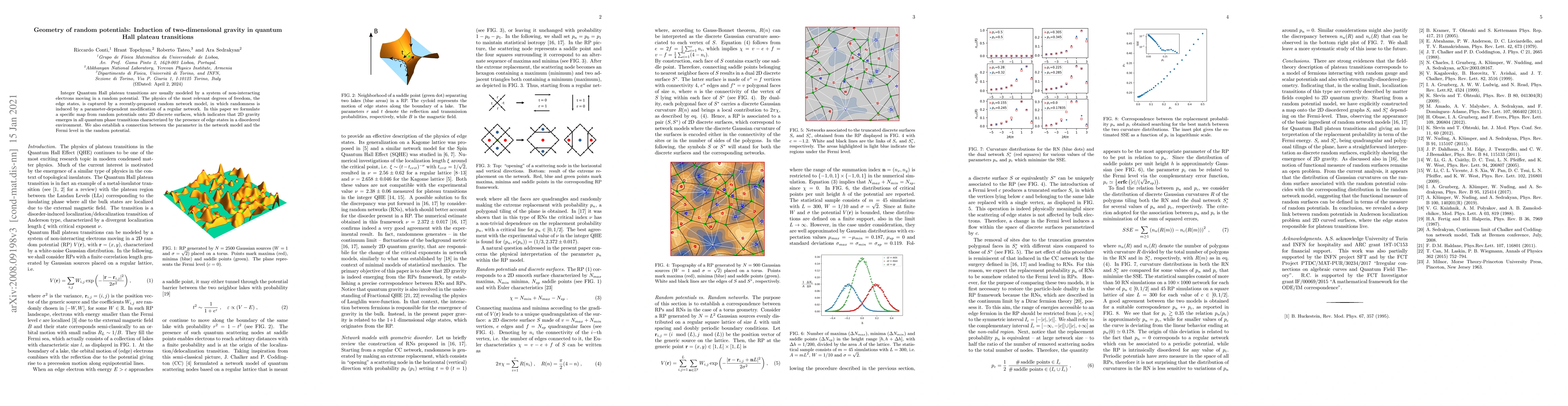 In the context of the Integer Quantum Hall plateau transitions, we formulate a specific map from random landscape potentials onto 2D discrete random surfaces. Critical points of the potential, namely maxima, minima and saddle points uniquely define a discrete surface $S$ and its dual $S^*$ made of quadrangular and $n-$gonal faces, respectively, thereby linking the geometry of the potential with the geometry of discrete surfaces. The map is parameter-dependent on the Fermi level. Edge states of Fermi lakes moving along equipotential contours between neighbour saddle points form a network of scatterings, which define the geometric basis, in the fermionic model, for the plateau transitions. The replacement probability characterizing the network model with geometric disorder recently proposed by Gruzberg, Kl\"umper, Nuding and Sedrakyan, is physically interpreted within the current framework as a parameter connected with the Fermi level.