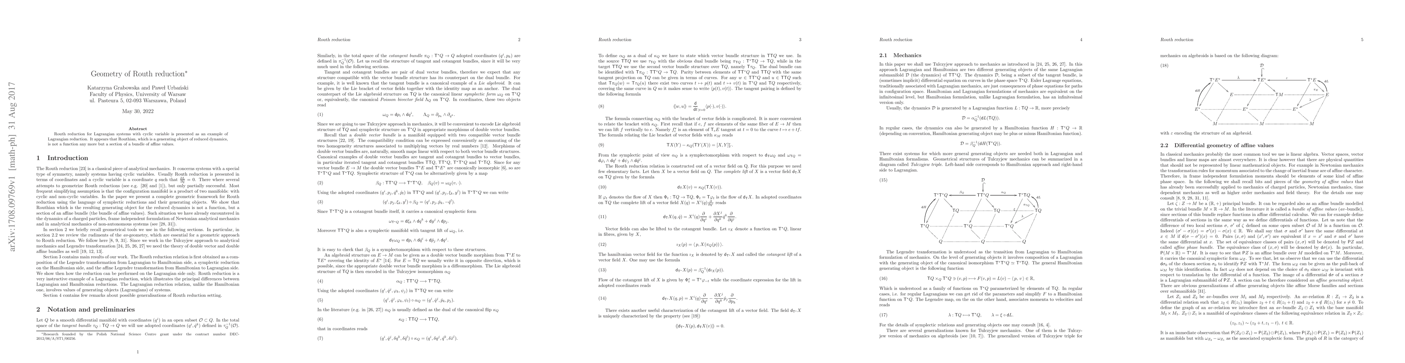 Summary: This paper explores the Routh reduction method for Lagrangian systems with cyclic variables, presenting it as a form of Lagrangian reduction. It reveals that the Routhian, traditionally seen as a generating function, is actually a section of a bundle of affine values in the reduced dynamics.
