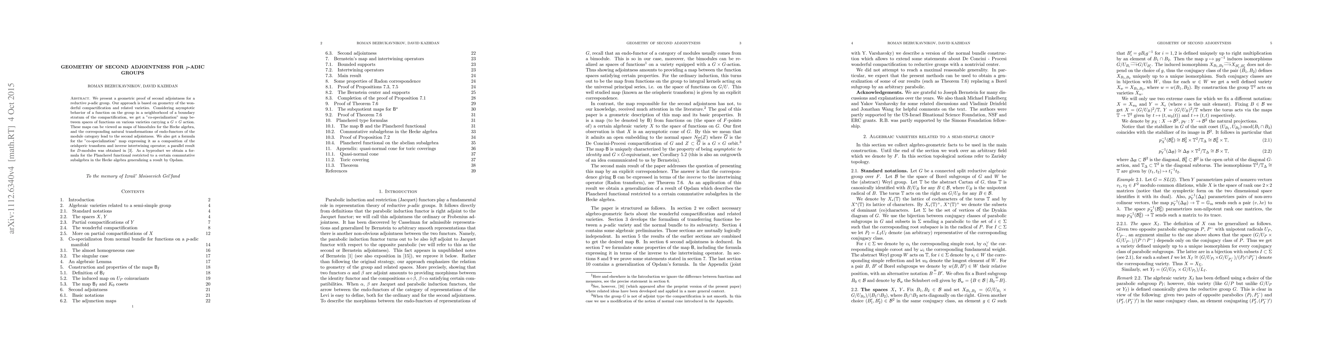 We present a geometric proof of Bernstein's second adjointness for a reductive $p$-adic group. Our approach is based on geometry of the wonderful compactification and related varieties. Considering asymptotic behavior of a function on the group in a neighborhood of a boundary stratum of the compactification, we get a "co-specialization" map between spaces of functions on various varieties with $G\times G$ action. These maps can be viewed as maps of bimodules for the Hecke algebra, and the corresponding natural transformations of functors lead to the second adjointness. We also get a formula for the "co-specialization" map expressing it as a composition of the orishperic transform and inverse intertwining operator; a parallel result for $D$-modules was obtained in arXiv:0902.1493. As a byproduct we obtain a formula for the Plancherel functional restricted to a certain commutative subalgebra in the Hecke algebra, generalizing a result by Opdam.