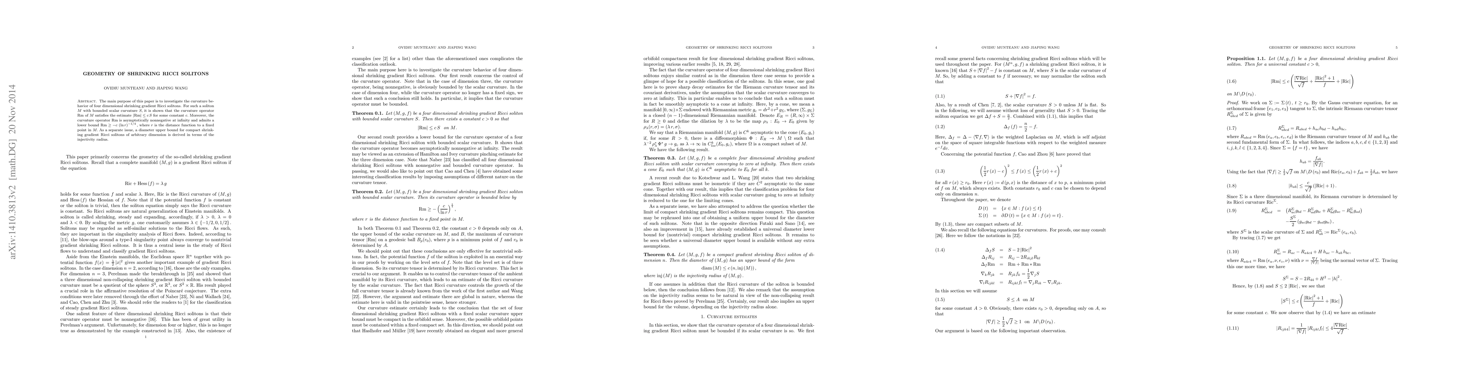 This paper examines four-dimensional shrinking gradient Ricci solitons, proving that their curvature operator satisfies certain bounds and is asymptotically nonnegative. It also shows that if scalar curvature vanishes at infinity, the manifold is asymptotically conical, and provides a diameter upper bound for compact solitons in any dimension.