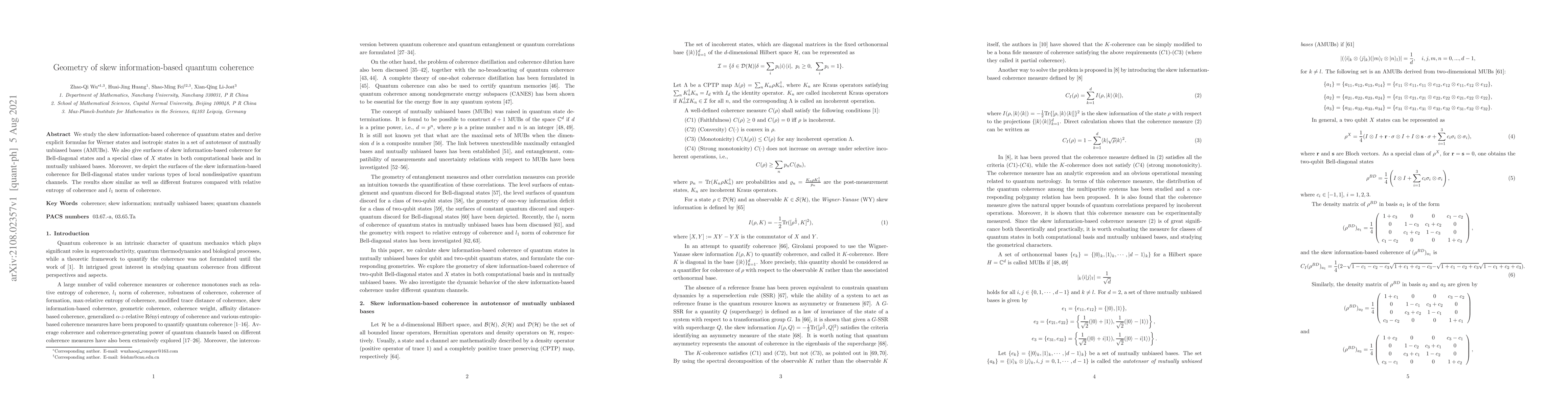 This paper investigates skew information-based coherence in quantum states, deriving explicit formulas for Werner and isotropic states within autotensors of mutually unbiased bases. It also presents coherence surfaces for Bell-diagonal and special X states, and examines the effects of local nondissipative quantum channels, revealing both similarities and differences compared to relative entropy and l1 norm of coherence.
