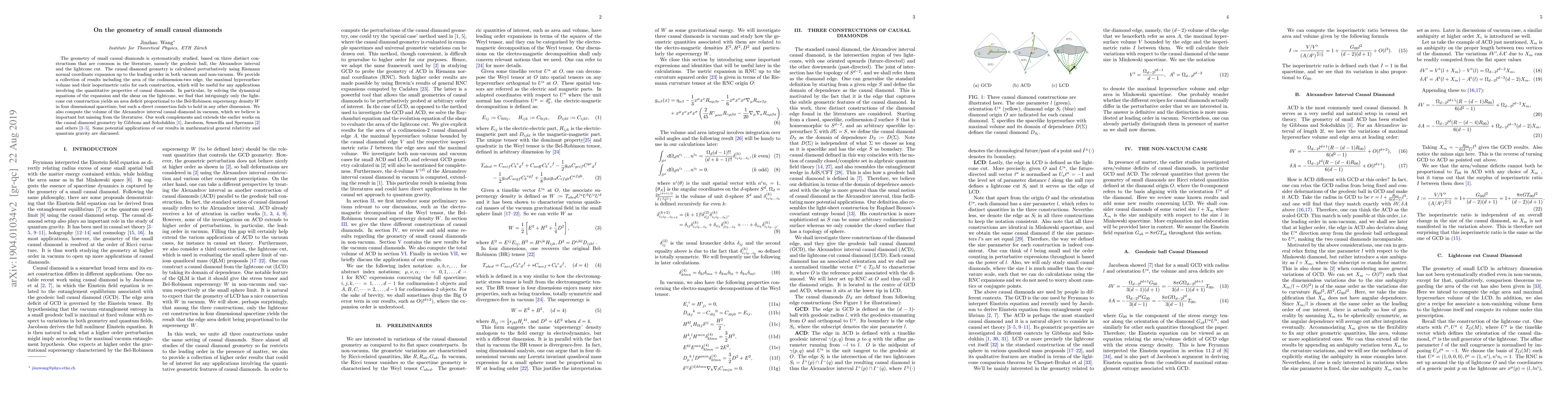 This paper systematically studies the geometry of small causal diamonds using three constructions: geodesic ball, Alexandrov interval, and lightcone cut. It provides results on the area, volume, and isoperimetric ratio for each, revealing that only the lightcone cut construction shows an area deficit proportional to the Bel-Robinson superenergy density in four dimensions. The findings extend prior research and have potential applications in mathematical general relativity and quantum gravity.