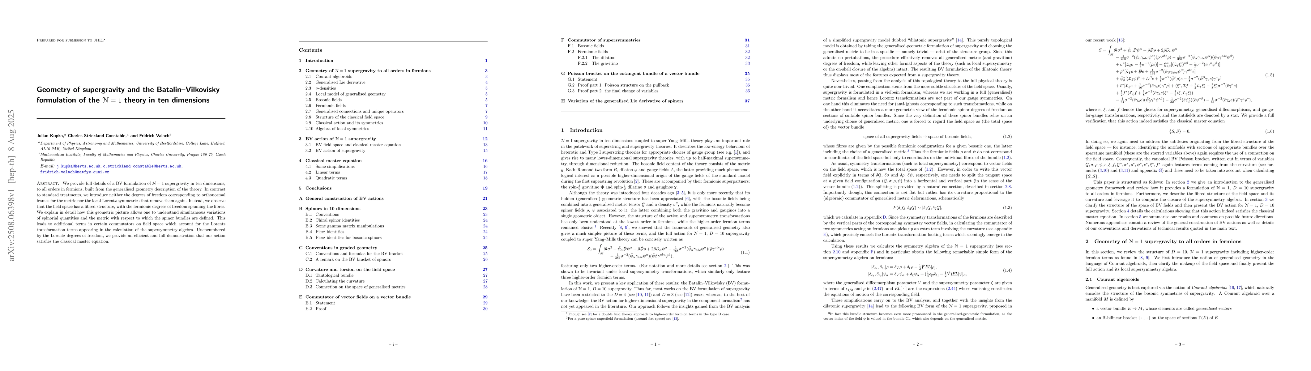 We provide full details of a BV formulation of $\mathcal N=1$ supergravity in ten dimensions, to all orders in fermions, built from the generalised geometry description of the theory. In contrast to standard treatments, we introduce neither the degrees of freedom corresponding to orthonormal frames for the metric nor the local Lorentz symmetries that remove them again. Instead, we observe that the field space has a fibred structure, with the fermionic degrees of freedom spanning the fibres. We explain in detail how this geometric picture allows one to understand simultaneous variations of spinorial quantities and the metric with respect to which the spinor bundles are defined. This leads to additional terms in certain commutators on field space which account for the Lorentz transformation terms appearing in the calculation of the supersymmetry algebra. Unencumbered by the Lorentz degrees of freedom, we provide an efficient and full demonstration that our action satisfies the classical master equation.