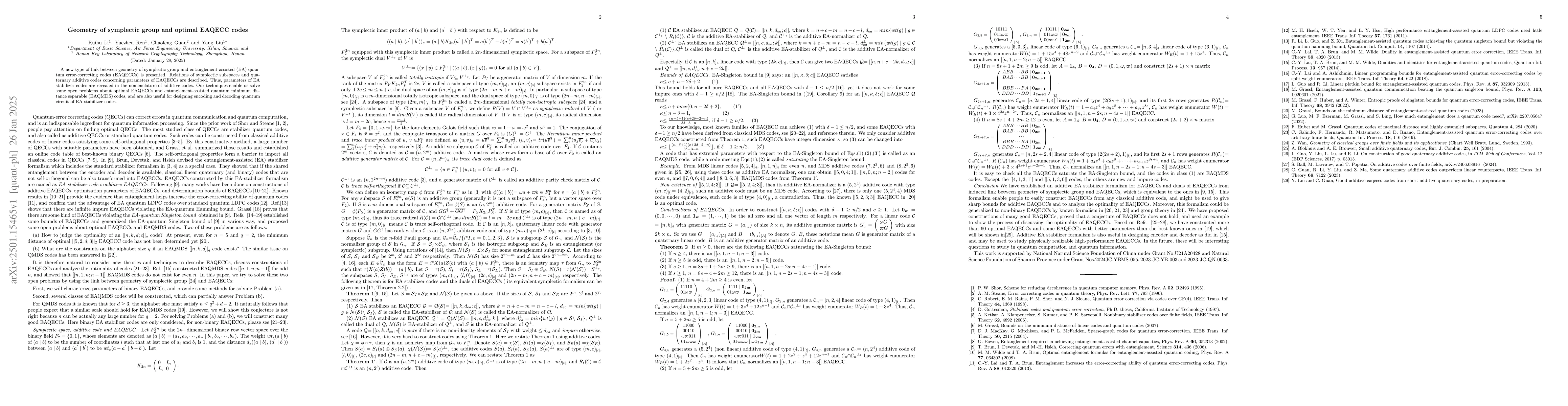 This paper establishes a geometric link between the symplectic group and entanglement-assisted quantum error-correcting codes (EAQECCs), revealing parameters of EA stabilizer codes in terms of additive codes. The study solves open problems regarding optimal EAQECCs and EAQMDS codes, providing a foundation for designing quantum circuits for encoding and decoding EA stabilizer codes.