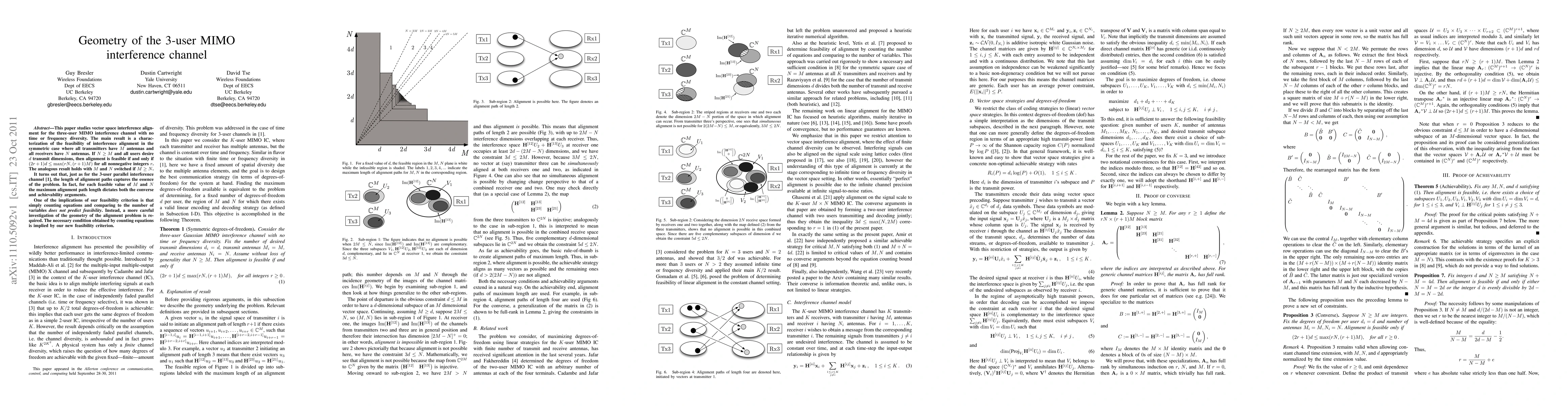 This paper investigates the feasibility of interference alignment in a three-user MIMO interference channel without time or frequency diversity. It characterizes alignment feasibility based on the geometry of vector spaces, revealing that alignment is possible if certain dimensional conditions are met, rather than merely counting equations.