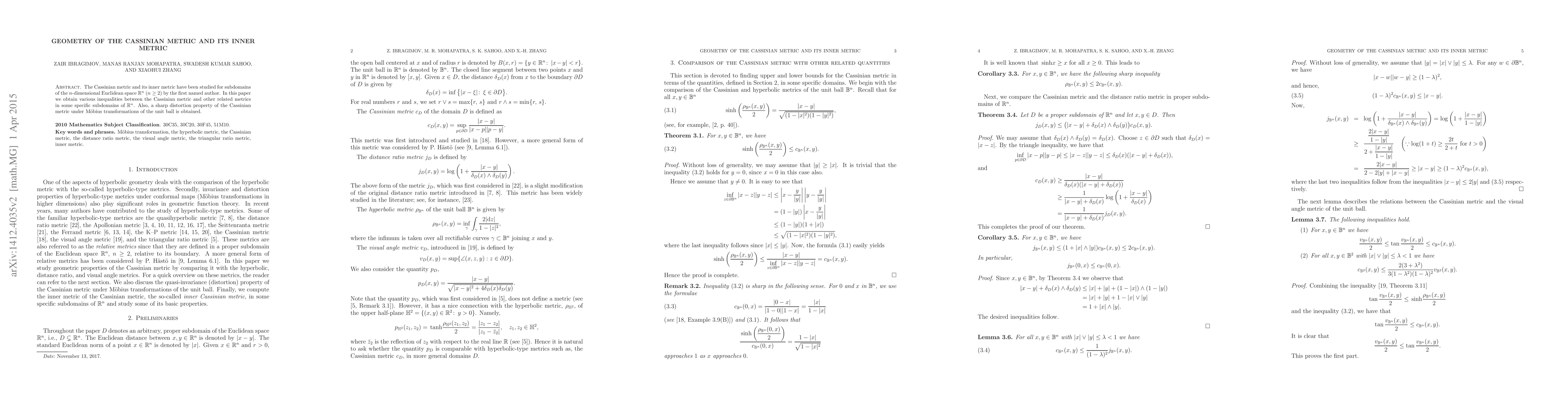 The Cassinian metric and its inner metric have been studied for subdomains of the $n$-dimensional Euclidean space $\mathbb{R}^n$ ($n\ge 2$) by the first named author. In this paper we obtain various inequalities between the Cassinian metric and other related metrics in some specific subdomains of $\mathbb{R}^n$. Also, a sharp distortion property of the Cassinian metric under M\"obius transformations of the unit ball is obtained.