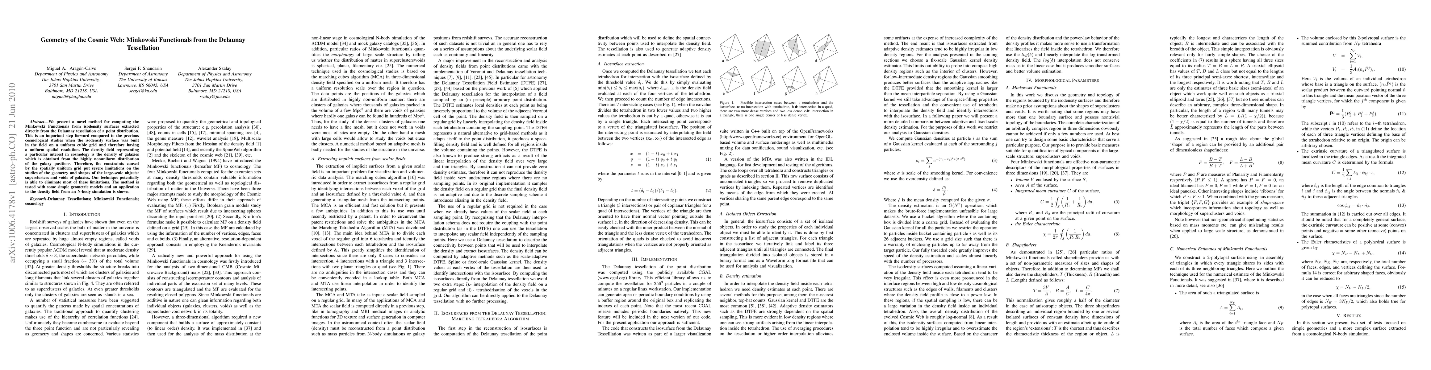 We present a novel method for computing the Minkowski Functionals from isodensity surfaces extracted directly from the Delaunay tessellation of a point distribution. This is an important step forward compared to the previous cosmological studies when the isodensity surface was built in the field on a uniform cubic grid and therefore having a uniform spatial resolution. The density field representing a particular interest in cosmology is the density of galaxies which is obtained from the highly nonuniform distribution of the galaxy positions. Therefore, the constraints caused by the spatially uniform grid put severe limitations on the studies of the geometry and shapes of the large-scale objects: superclusters and voids of galaxies. Our technique potentially is able to eliminate most of these limitations. The method is tested with some simple geometric models and an application to the density field from an N-body simulation is shown.