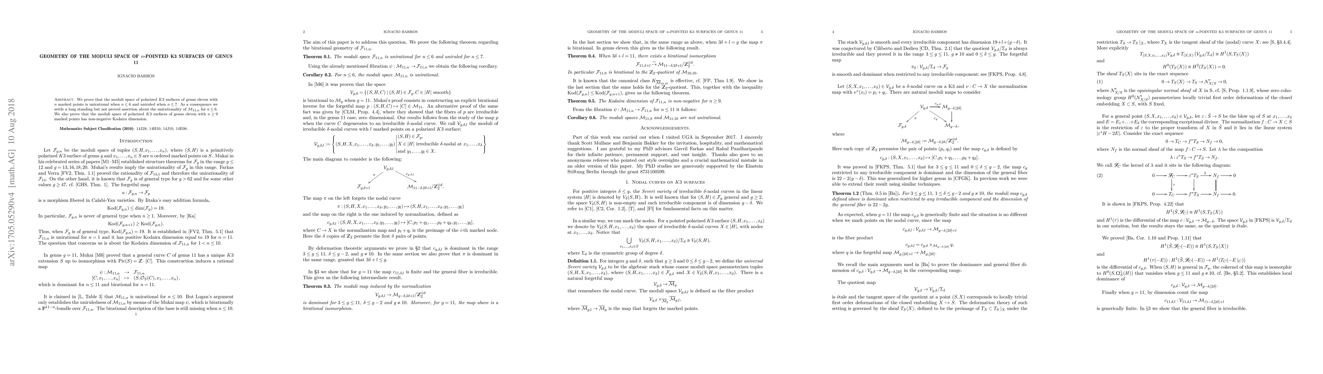 Summary: This paper establishes the unirationality and uniruled nature of the moduli space for certain $n$-pointed K3 surfaces of genus 11, resolving longstanding conjectures for $n\leq 6$ and proving non-negative Kodaira dimension for $n=9$.