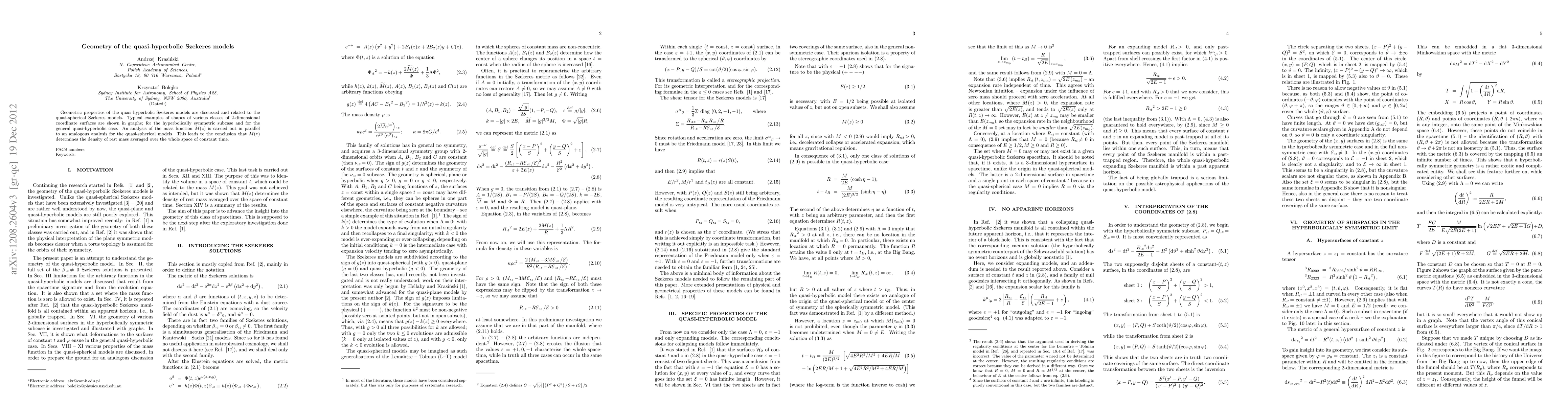 This paper explores the geometric properties of quasi-hyperbolic Szekeres models, comparing them to quasi-spherical models, and presents graphical examples of 2D coordinate surfaces. An analysis of the mass function $M(z)$ reveals its role in determining the density of rest mass averaged over space at constant time.