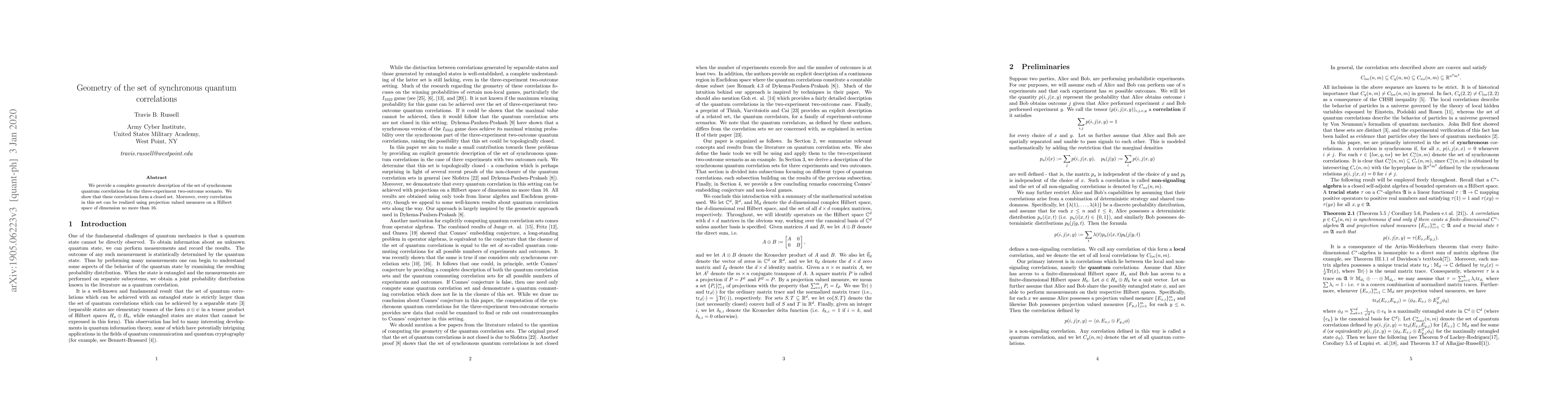 Summary: This paper offers a comprehensive geometric analysis of synchronous quantum correlations in a three-experiment, two-outcome scenario, demonstrating that they form a closed set and can be realized using projection valued measures on a Hilbert space of dimension at most 16.