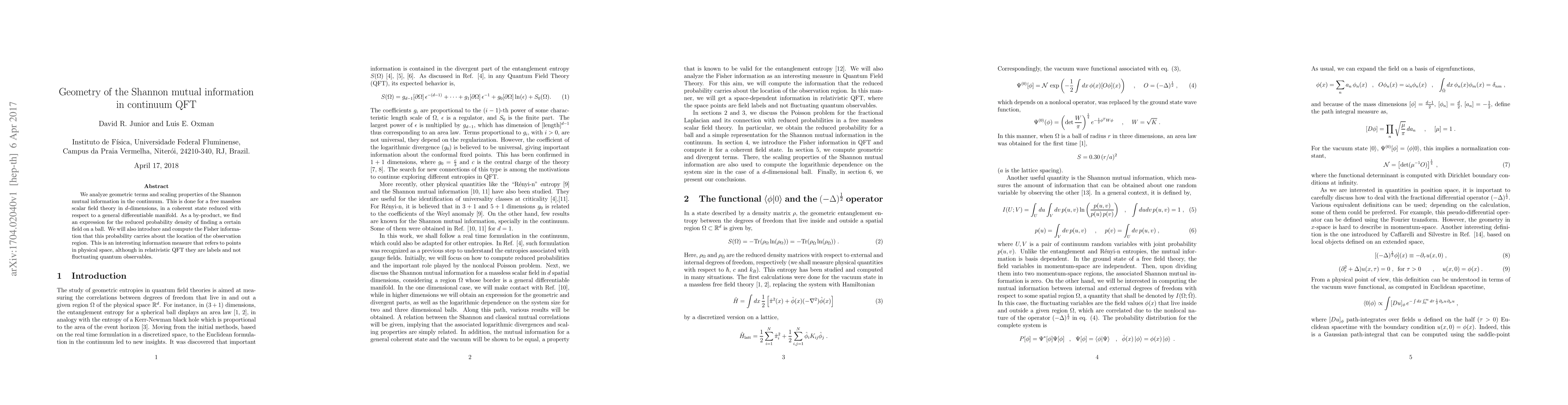 This paper investigates the geometric aspects and scaling properties of Shannon mutual information in continuum quantum field theory (QFT), focusing on a free massless scalar field in $d$-dimensions. It derives expressions for the reduced probability density and introduces the Fisher information, providing insights into information measures related to physical space in relativistic QFT.