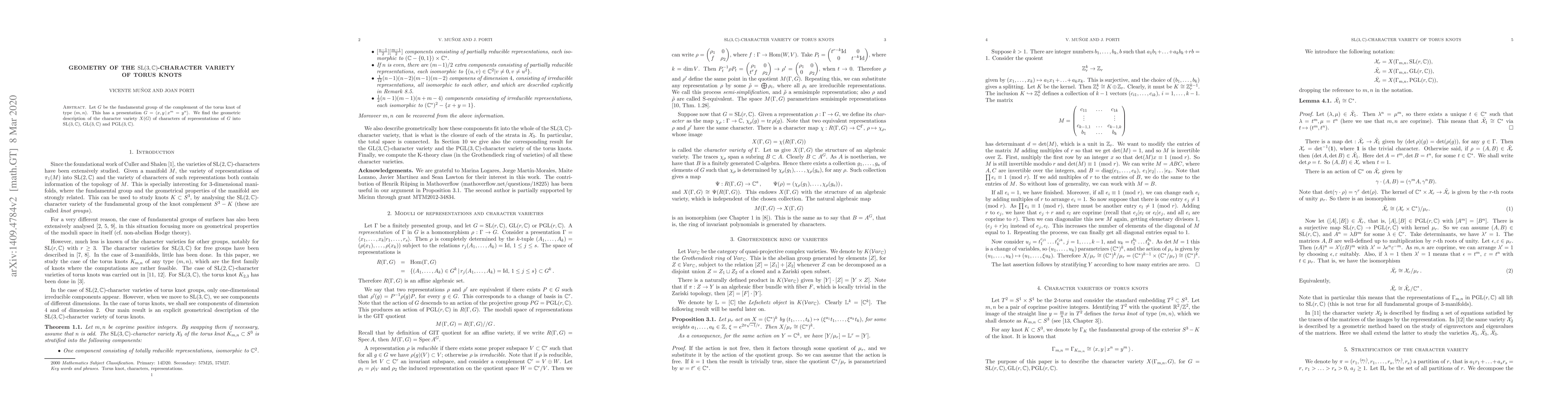 This paper provides a geometric description of the character variety X(G) for representations of the fundamental group G of a torus knot's complement into SL(3,C), GL(3,C), and PGL(3,C). It focuses on the algebraic structure and geometric properties of these representations.