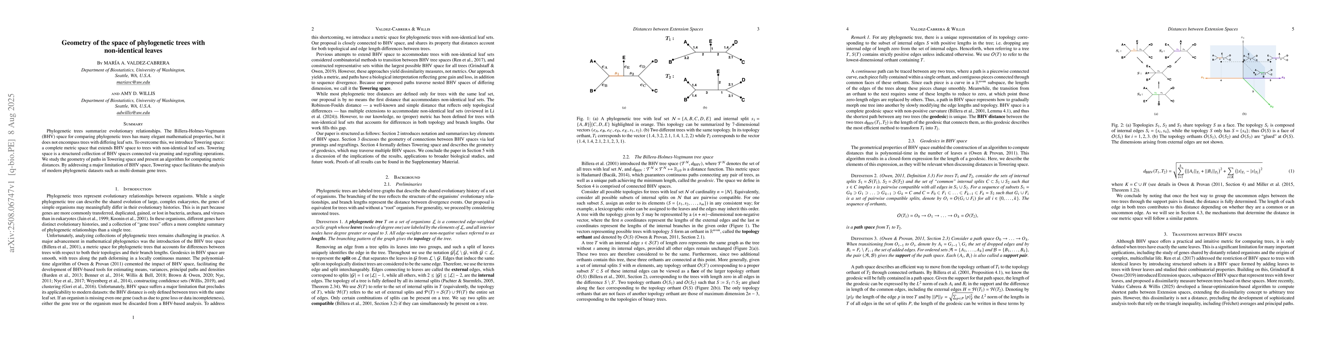 Phylogenetic trees summarize evolutionary relationships. The Billera-Holmes-Vogtmann (BHV) space for comparing phylogenetic trees has many elegant mathematical properties, but it does not encompass trees with differing leaf sets. To overcome this, we introduce Towering space: a complete metric space that extends BHV space to trees with non-identical leaf sets. Towering space is a structured collection of BHV spaces connected via pruning and regrafting operations. We study the geometry of paths in Towering space and present an algorithm for computing metric distances. By addressing a major limitation of BHV space, Towering space facilitates the analysis of modern phylogenetic datasets such as multi-domain gene trees.