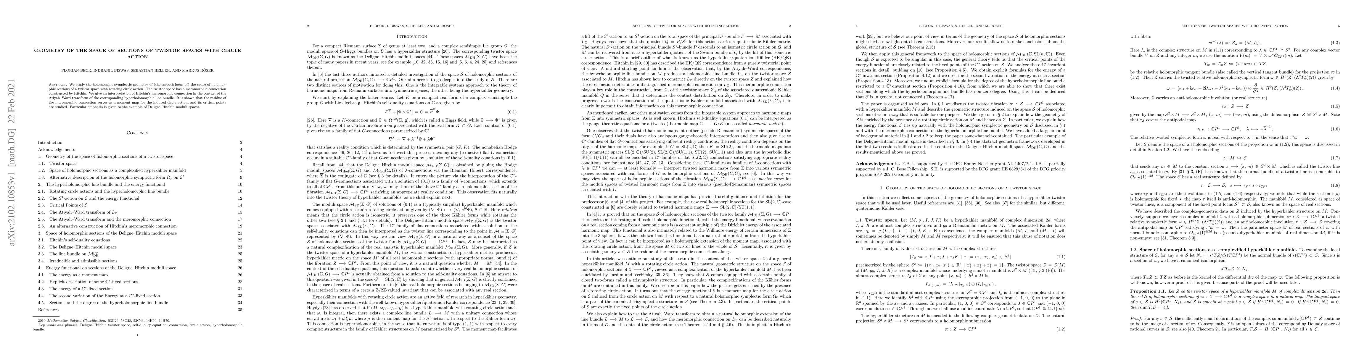 The paper presents a detailed analysis of the geometry of sections in twistor spaces with circle action, linking Hitchin's meromorphic connection to the Atiyah-Ward transform, and providing a moment map interpretation.
