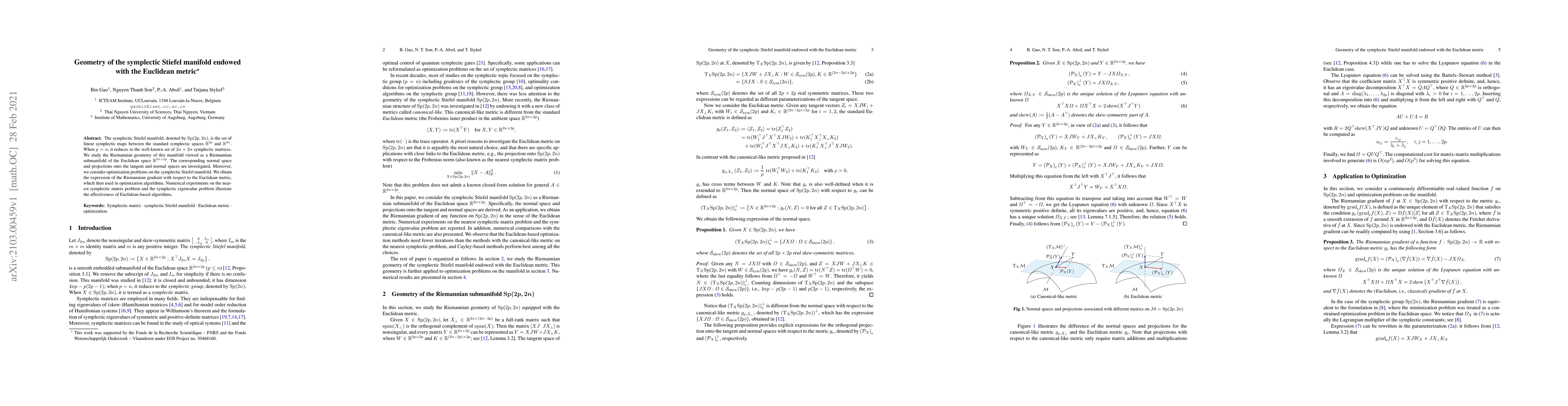 The symplectic Stiefel manifold, denoted by $\mathrm{Sp}(2p,2n)$, is the set of linear symplectic maps between the standard symplectic spaces $\mathbb{R}^{2p}$ and $\mathbb{R}^{2n}$. When $p=n$, it reduces to the well-known set of $2n\times 2n$ symplectic matrices. We study the Riemannian geometry of this manifold viewed as a Riemannian submanifold of the Euclidean space $\mathbb{R}^{2n\times 2p}$. The corresponding normal space and projections onto the tangent and normal spaces are investigated. Moreover, we consider optimization problems on the symplectic Stiefel manifold. We obtain the expression of the Riemannian gradient with respect to the Euclidean metric, which then used in optimization algorithms. Numerical experiments on the nearest symplectic matrix problem and the symplectic eigenvalue problem illustrate the effectiveness of Euclidean-based algorithms.