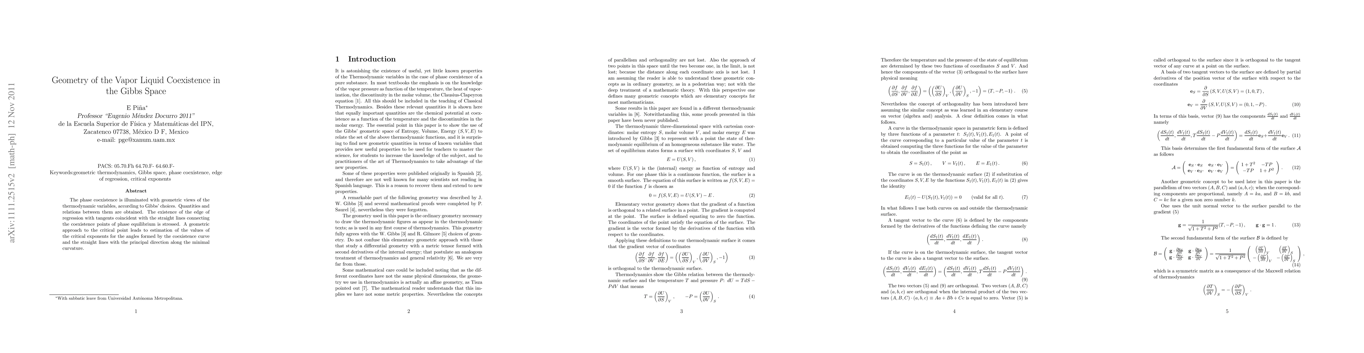 The phase coexistence is illuminated with geometric views of the thermodynamic variables, according to Gibbs' choices. Quantities and relations between them are obtained. The existence of the edge of regression with tangents coincident with the straight lines connecting the coexistence points of phase equilibrium is stressed. A geometric approach to the critical point leads to estimation of the values of the critical exponents for the angles formed by the coexistence curve and the straight lines with the principal direction along the minimal curvature.