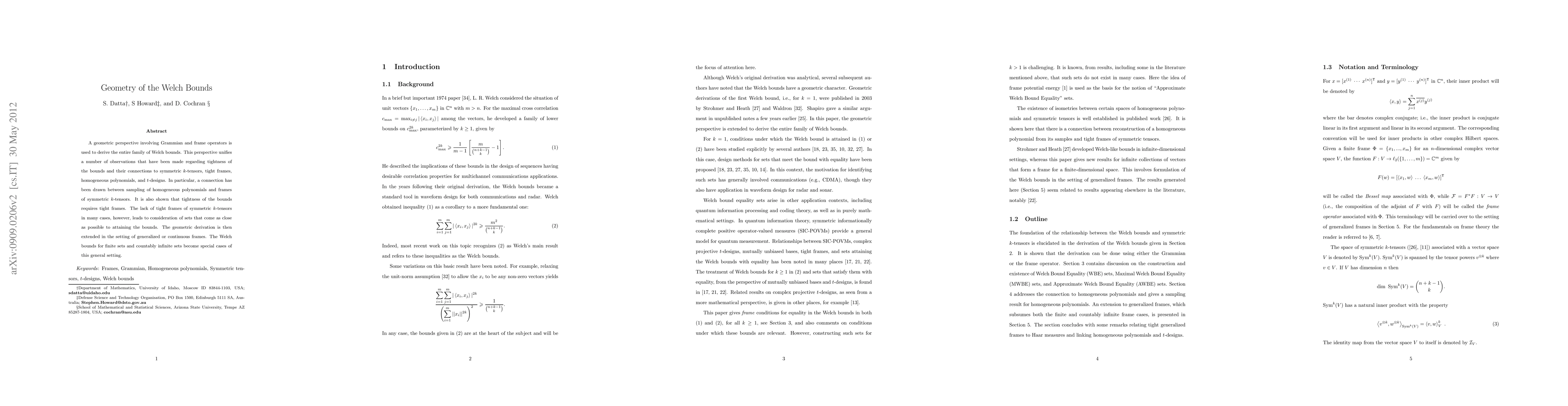 A geometric perspective involving Grammian and frame operators is used to derive the entire family of Welch bounds. This perspective unifies a number of observations that have been made regarding tightness of the bounds and their connections to symmetric k-tensors, tight frames, homogeneous polynomials, and t-designs. In particular. a connection has been drawn between sampling of homogeneous polynomials and frames of symmetric k-tensors. It is also shown that tightness of the bounds requires tight frames. The lack of tight frames in symmetric k-tensors in many cases, however, leads to consideration of sets that come as close as possible to attaining the bounds. The geometric derivation is then extended in the setting of generalized or continuous frames. The Welch bounds for finite sets and countably infinite sets become special cases of this general setting.